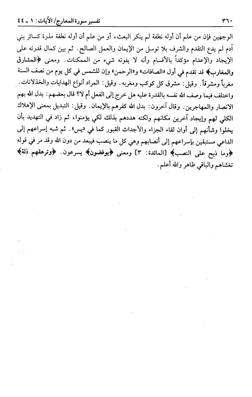 واختلف فيما وصف الله نفسه بالقدرة عليه هل خرج إلى الفعل أم لا؟ قال بعضهم: بدل الله بهم الأنصار والمهاجرين. وقال آخرون: بدل الله كفرهم بالإيمان. وقيل: التبديل بمعنى الإهلاك الكلي لهم وإيجاد آخرين مكانهم ولكنه هددهم بذلك لكي يؤمنوا، ثم زاد في التهديد بأن يخلوا وشأنهم إلى أوان لقاء الجزاء والأجداث القبور كما في «يس» . ثم شبه إسراعهم إلى الداعي مستبقين بإسراعهم إلى أنصابهم وهي كل ما ينصب فيبعد من دون الله وقد مر في قوله وَما ذُبِحَ عَلَى النُّصُبِ [المائدة: 3] ومعنى يُوفِضُونَ يسرعون. وَتَرْهَقُهُمْ ذِلَّةٌ تغشاهم والباقي ظاهر والله أعلم.