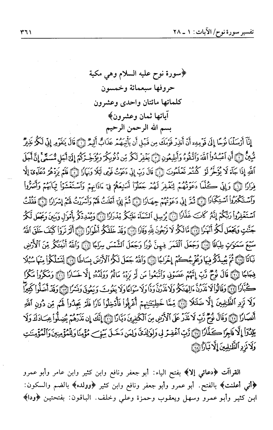 دعائي إلا بفتح الياء: أبو جعفر ونافع وابن كثير وابن عامر وأبو عمرو أني أعلنت بالفتح. أبو عمرو وأبو جعفر ونافع وابن كثير وَوَلَدُهُ بالضم والسكون:
