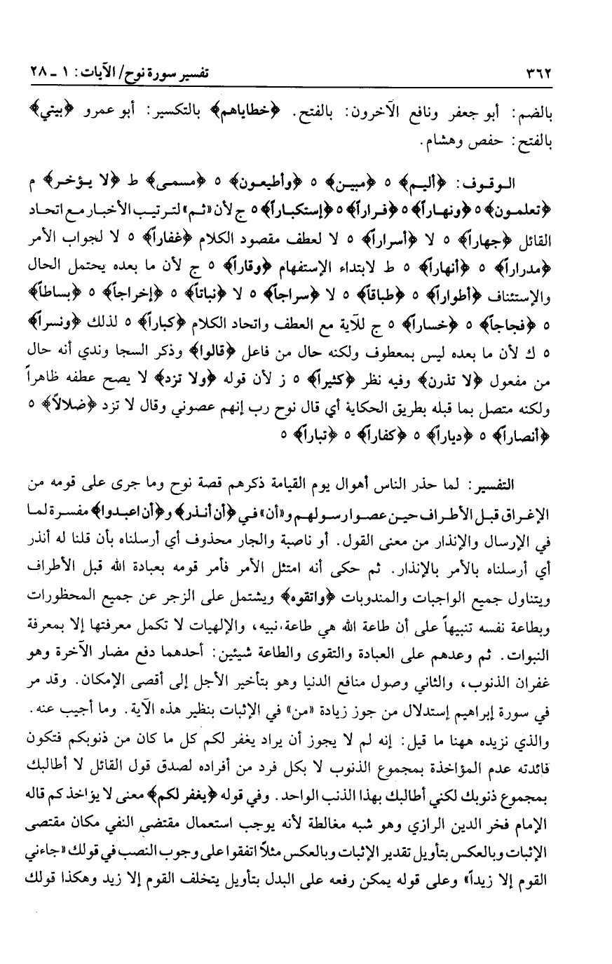 أَلِيمٌ هـ مُبِينٌ هـ وَأَطِيعُونِ هـ مُسَمًّى ط لا يُؤَخَّرُ م تَعْلَمُونَ هـ وَنَهاراً هـ فِراراً هـ اسْتِكْباراً هـ ج لأن «ثم» لترتيب الأخبار مع اتحاد القائل جِهاراً هـ لا إِسْراراً هـ لا لعطف مقصود الكلام غَفَّاراً هـ لا لجواب الأمر مِدْراراً هـ أَنْهاراً هـ ط لابتداء الاستفهام وَقاراً هـ ج لأن ما بعده يحتمل الحال والاستئناف أَطْواراً هـ طِباقاً هـ لا سِراجاً هـ لا نَباتاً هـ إِخْراجاً هـ بِساطاً هـ فِجاجاً