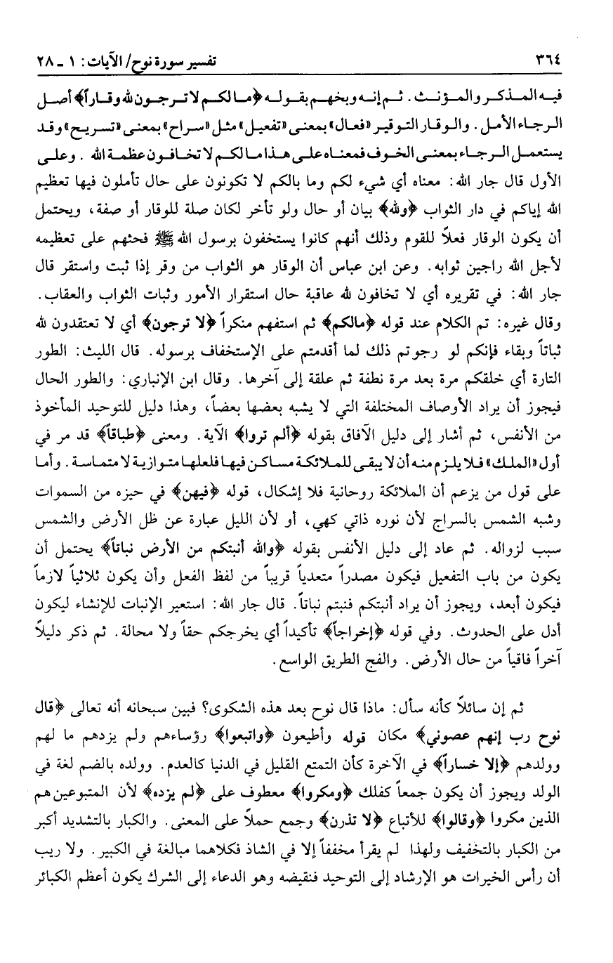 فيه المذكر والمؤنث. ثم إنه وبخهم بقوله ما لَكُمْ لا تَرْجُونَ لِلَّهِ وَقاراً أصل الرجاء الأمل. والوقار التوقير «فعال» بمعنى «تفعيل» مثل «سراح» بمعنى «تسريح» وقد يستعمل الرجاء بمعنى الخوف فمعناه على هذا ما لكم لا تخافون عظمة الله. وعلى الأول قال جار الله: معناه أي شيء لكم وما بالكم لا تكونون على حال تأملون فيها تعظيم الله إياكم في دار الثواب ولِلَّهِ بيان أو حال ولو تأخر لكان صلة للوقار أو صفة، ويحتمل أن يكون الوقار فعلا للقوم وذلك أنهم كانوا يستخفون برسول الله صلى الله عليه وسلم فحثهم على تعظيمه لأجل الله راجين ثوابه. وعن ابن عباس أن الوقار هو الثواب من وقر إذا ثبت واستقر قال جار الله: في تقريره أي لا تخافون لله عاقبة حال استقرار الأمور وثبات الثواب والعقاب.
