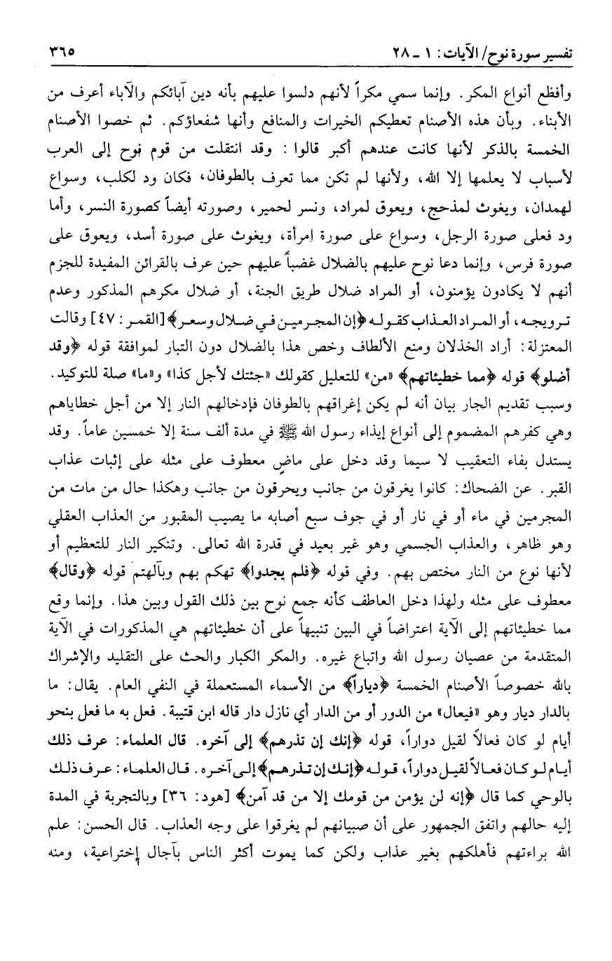 وأفظع أنواع المكر. وإنما سمي مكرا لأنهم دلسوا عليهم بأنه دين آبائكم والآباء أعرف من الأبناء. وبأن هذه الأصنام تعطيكم الخيرات والمنافع وأنها شفعاؤكم. ثم خصوا الأصنام الخمسة بالذكر لأنها كانت عندهم أكبر قالوا: وقد انتقلت من قوم نوح إلى العرب لأسباب لا يعلمها إلا الله، ولأنها لم تكن مما تعرف بالطوفان، فكان ود لكلب، وسواع لهمدان، ويغوث لمذحج، ويعوق لمراد، ونسر لحمير، وصورته أيضا كصورة النسر، وأما ود فعلى صورة الرجل، وسواع على صورة امرأة، ويغوث على صورة أسد، ويعوق على صورة فرس، وإنما دعا نوح عليهم بالضلال غضبا عليهم حين عرف بالقرائن المفيدة للجزم أنهم لا يكادون يؤمنون، أو المراد ضلال طريق الجنة، أو ضلال مكرهم المذكور وعدم ترويجه، أو المراد العذاب كقوله إِنَّ الْمُجْرِمِينَ فِي ضَلالٍ وَسُعُرٍ [القمر: 47] وقالت المعتزلة: أراد الخذلان ومنع الألطاف وخص هذا بالضلال دون التبار لموافقة قوله وَقَدْ أَضَلُّوا قوله مِمَّا خَطِيئاتِهِمْ «من» للتعليل كقولك «جئتك لأجل كذا» و «ما» صلة للتوكيد.