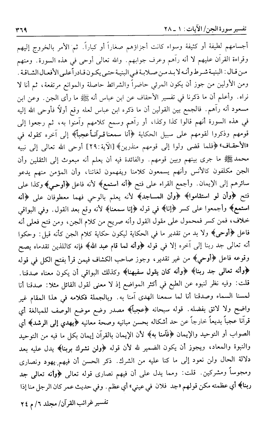 ومن الأولين من جوز أن يكون المرئي حاضرا والشرائط حاصلة والموانع مرتفعة، ثم أنا لا نراه. وأعلم أن ما ذكرنا في تفسير الأحقاف عن ابن عباس أنه صلى الله عليه وسلم ما رأى الجن. وعن ابن مسعود أنه رآهم. فالجمع بين القولين أن ما ذكره ابن عباس لعله وقع أولا فأوحى الله إليه في هذه السورة أنهم قالوا كذا وكذا، أو رآهم وسمع كلامهم وآمنوا به، ثم رجعوا إلى قومهم وذكروا لقومهم على سبيل الحكاية إِنَّا سَمِعْنا قُرْآناً عَجَباً إلى آخره كقوله في «الأحقاف» فَلَمَّا قُضِيَ وَلَّوْا إِلى قَوْمِهِمْ مُنْذِرِينَ [الآية: 29] أوحى الله تعالى إلى نبيه محمد صلى الله عليه وسلم ما جرى بينهم وبين قومهم. والفائدة فيه أن يعلم أنه مبعوث إلى الثقلين وأن الجن مكلفون كالأنس وأنهم يسمعون كلامنا ويفهمون لغاتنا، وأن المؤمن منهم يدعو سائرهم إلى الإيمان. وأجمع القراء على فتح أَنَّهُ اسْتَمَعَ لأنه فاعل أُوحِيَ وكذا على فتح وَأَنْ لَوِ اسْتَقامُوا وَأَنَّ الْمَساجِدَ لأنه يعلم بالوحي فهما معطوفان على أَنَّهُ اسْتَمَعَ وأجمعوا على كسر إِنَّا في قوله إِنَّا سَمِعْنا لأنه وقع بعد القول. وفي البواقي خلاف، فمن كسر فمحمول على مقول القول وأنه صريح من كلام الجن، ومن فتح فعلى أنه فاعل أُوحِيَ ولا بد من تقدير ما في الحكاية ليكون حكاية كلام الجن كأنه قيل: وحكوا أنه تعالى جد ربنا إلى آخره إلا في قوله وَأَنَّهُ لَمَّا قامَ عَبْدُ اللَّهِ فإنه كاللذين تقدماه يصح وقوعه فاعل أُوحِيَ من غير تقدير، وجوز صاحب الكشاف فيمن قرأ بفتح الكل في قوله وَأَنَّهُ تَعالى جَدُّ رَبِّنا وَأَنَّهُ كانَ يَقُولُ سَفِيهُنا وكذلك البواقي أن يكون معناه صدقنا.