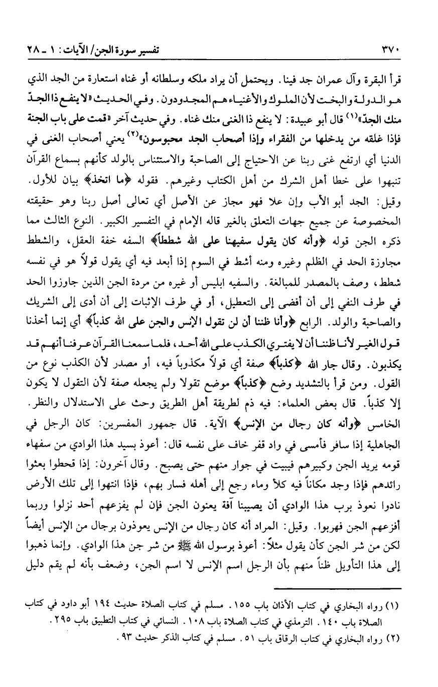 وقيل: الجد أبو الأب وإن علا فهو مجاز عن الأصل أي تعالى أصل ربنا وهو حقيقته المخصوصة عن جميع جهات التعلق بالغير قاله الإمام في التفسير الكبير. النوع الثالث مما ذكره الجن قوله وَأَنَّهُ كانَ يَقُولُ سَفِيهُنا عَلَى اللَّهِ شَطَطاً السفه خفة العقل، والشطط مجاوزة الحد في الظلم وغيره ومنه أشط في السوم إذا أبعد فيه أي يقول قولا هو في نفسه شطط، وصف بالمصدر للمبالغة. والسفيه إبليس أو غيره من مردة الجن الذين جاوزوا الحد في طرف النفي إلى أن أفضى إلى التعطيل، أو في طرف الإثبات إلى أن أدى إلى الشريك والصاحبة والولد. الرابع وَأَنَّا ظَنَنَّا أَنْ لَنْ تَقُولَ الْإِنْسُ وَالْجِنُّ عَلَى اللَّهِ كَذِباً أي إنما أخذنا قول الغير لأنا ظننا أن لا يفتري الكذب على الله أحد، فلما سمعنا القرآن عرفنا أنهم قد يكذبون. وقال جار الله كَذِباً صفة أي قولا مكذوبا فيه، أو مصدر لأن الكذب نوع من القول. ومن قرأ بالتشديد وضع كَذِباً موضع تقولا ولم يجعله صفة لأن التقول لا يكون إلا كذبا. قال بعض العلماء: فيه ذم لطريقة أهل الطريق وحث على الاستدلال والنظر.