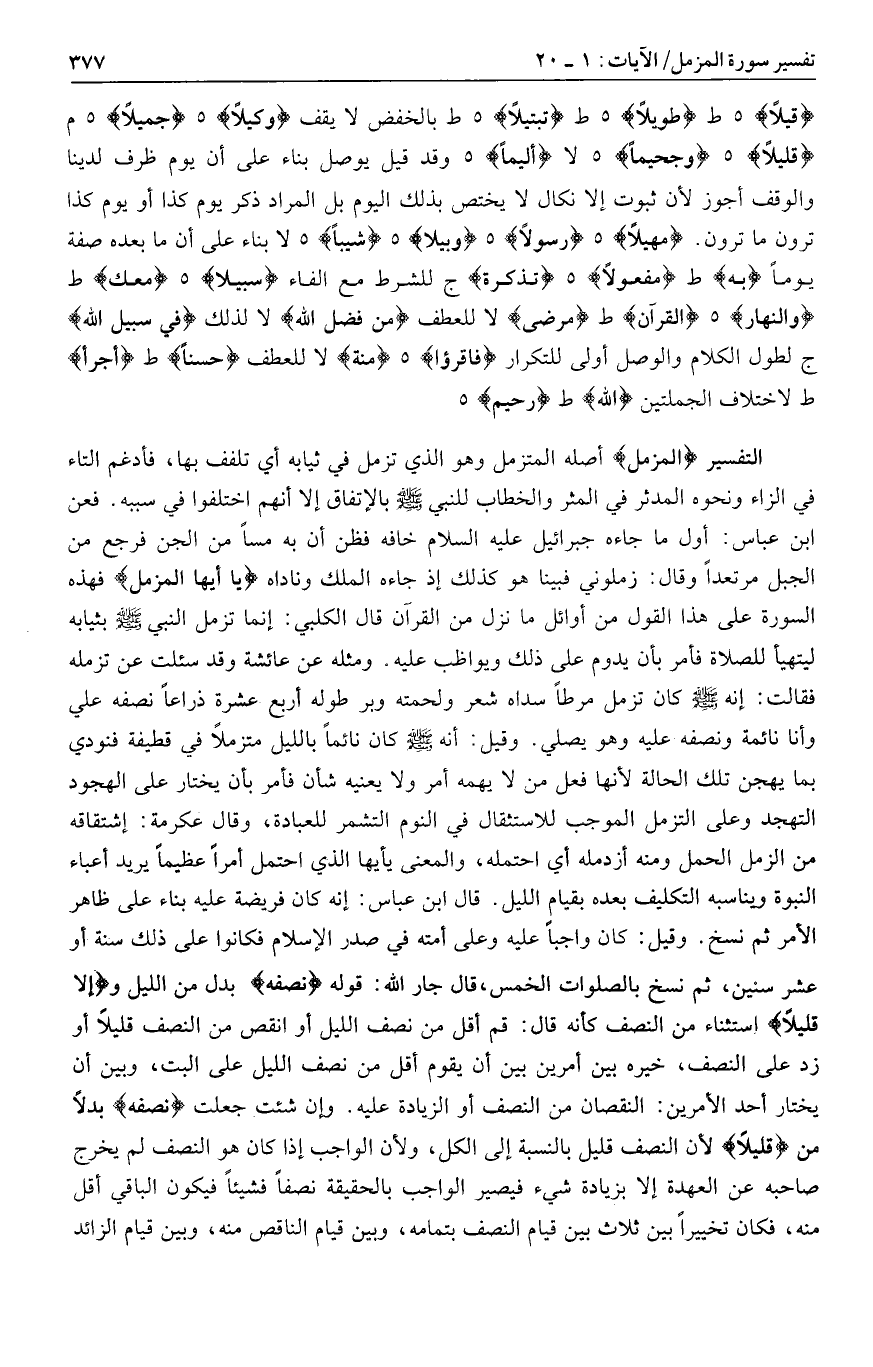 قِيلًا هـ ط طَوِيلًا هـ ط تَبْتِيلًا هـ ط بالخفض لا يقف وَكِيلًا هـ جَمِيلًا هـ م قَلِيلًا هـ وَجَحِيماً هـ لا أَلِيماً هـ وقد قيل يوصل بناء على أن يوم ظرف لدينا والوقف أجوز لأن ثبوت إلا نكال لا يختص بذلك اليوم بل المراد ذكر يوم كذا أو يوم كذا ترون ما ترون. مَهِيلًا هـ رَسُولًا هـ وَبِيلًا هـ شِيباً هـ لا بناء على أن ما بعده صفة يوما بِهِ ط مَفْعُولًا هـ تَذْكِرَةٌ ج للشرط مع الفاء سَبِيلًا هـ مَعَكَ ط وَالنَّهارَ هـ الْقُرْآنِ ط مَرْضى لا للعطف مِنْ فَضْلِ اللَّهِ لا لذلك فِي سَبِيلِ اللَّهِ ج لطول الكلام والوصل أولى للتكرار فَاقْرَؤُا هـ مِنْهُ لا للعطف حَسَناً ط أَجْراً ط لاختلاف الجملتين اللَّهُ ط رَحِيمٌ هـ