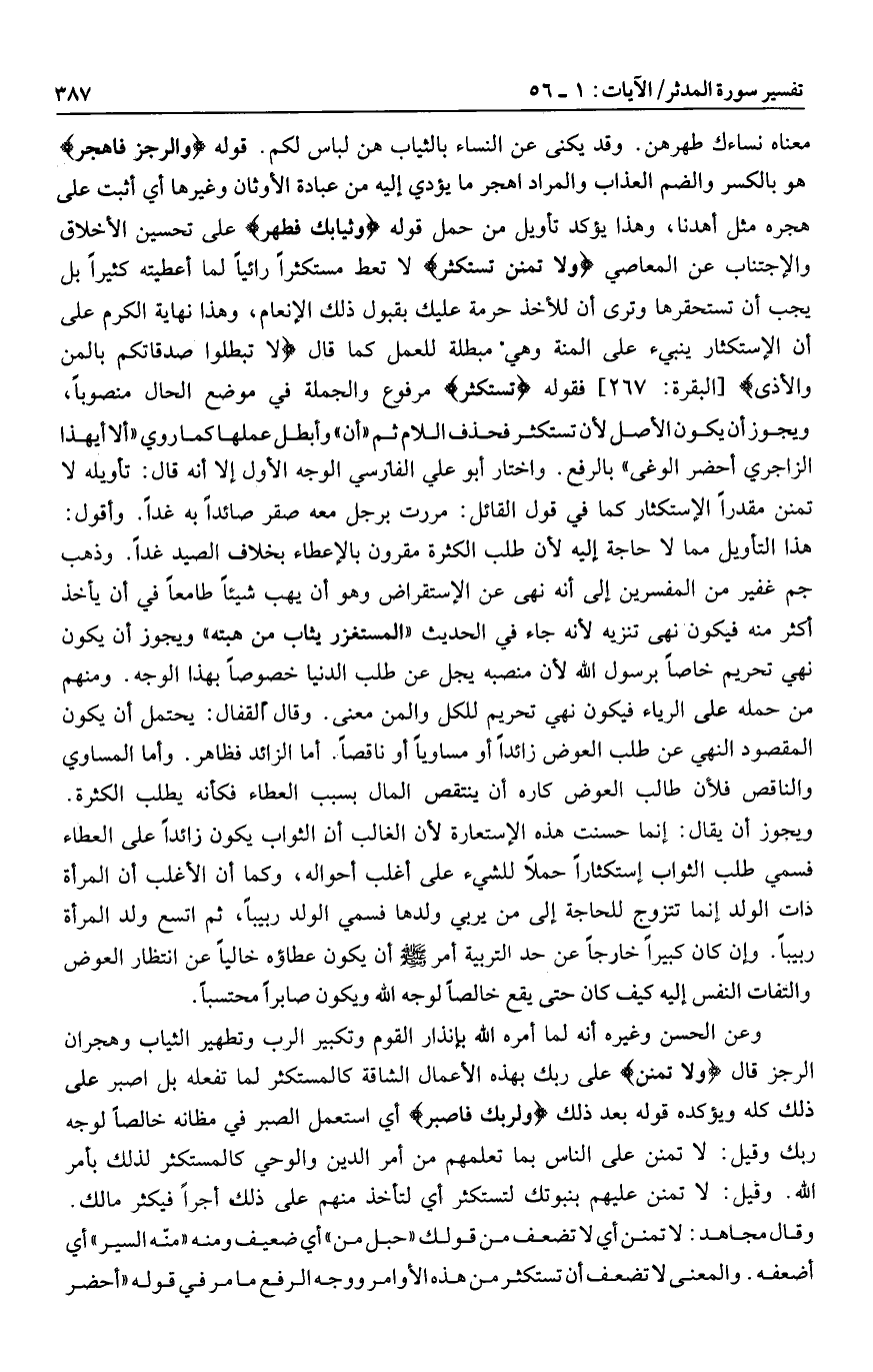 معناه نساءك طهرهن. وقد يكنى عن النساء بالثياب هن لباس لكم. قوله وَالرُّجْزَ فَاهْجُرْ هو بالكسر والضم العذاب والمراد اهجر ما يؤدي إليه من عبادة الأوثان وغيرها أي أثبت على هجره مثل أهدنا، وهذا يؤكد تأويل من حمل قوله وَثِيابَكَ فَطَهِّرْ على تحسين الأخلاق والاجتناب عن المعاصي وَلا تَمْنُنْ تَسْتَكْثِرُ لا تعط مستكثرا رائيا لما أعطيته كثيرا بل يجب أن تستحقرها وترى أن للأخذ حرمة عليك بقبول ذلك الإنعام، وهذا نهاية الكرم على أن الاستكثار ينبيء على المنة وهي مبطلة للعمل كما قال لا تُبْطِلُوا صَدَقاتِكُمْ بِالْمَنِّ وَالْأَذى [البقرة: 267] فقوله تَسْتَكْثِرُ مرفوع والجملة في موضع الحال منصوبا، ويجوز أن يكون الأصل لأن تستكثر فحذف اللام ثم «أن» وأبطل عملها كما