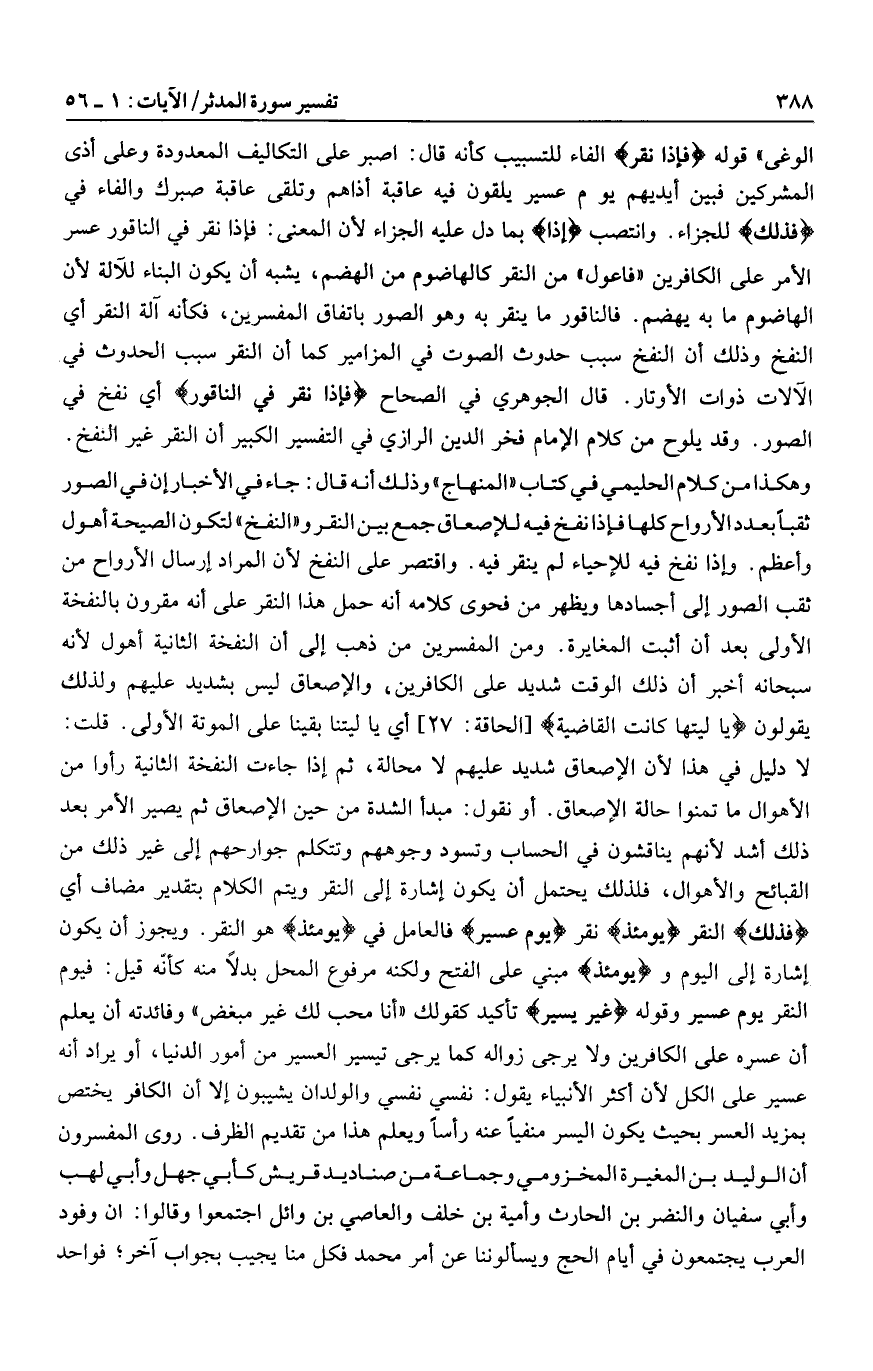 الوغى» قوله فَإِذا نُقِرَ الفاء للتسبيب كأنه قال: اصبر على التكاليف المعدودة وعلى أذى المشركين فبين أيديهم يوم عسير يلقون فيه عاقبة أذاهم وتلقى عاقبة صبرك والفاء في فَذلِكَ للجزاء. وانتصب فَإِذا بما دل عليه الجزاء لأن المعنى: فإذا نقر في الناقور عسر الأمر على الكافرين «فاعول» من النقر كالهاضوم من الهضم، يشبه أن يكون البناء للآلة لأن الهاضوم ما به يهضم. فالناقور ما ينقر به وهو الصور باتفاق المفسرين، فكأنه آلة النقر أي النفخ وذلك أن النفخ سبب حدوث الصوت في المزامير كما أن النقر سبب الحدوث في الآلات ذوات الأوتار. قال الجوهري في الصحاح فَإِذا نُقِرَ فِي النَّاقُورِ أي نفخ في الصور. وقد يلوح من كلام الإمام فخر الدين الرازي في التفسير الكبير أن النقر غير النفخ.