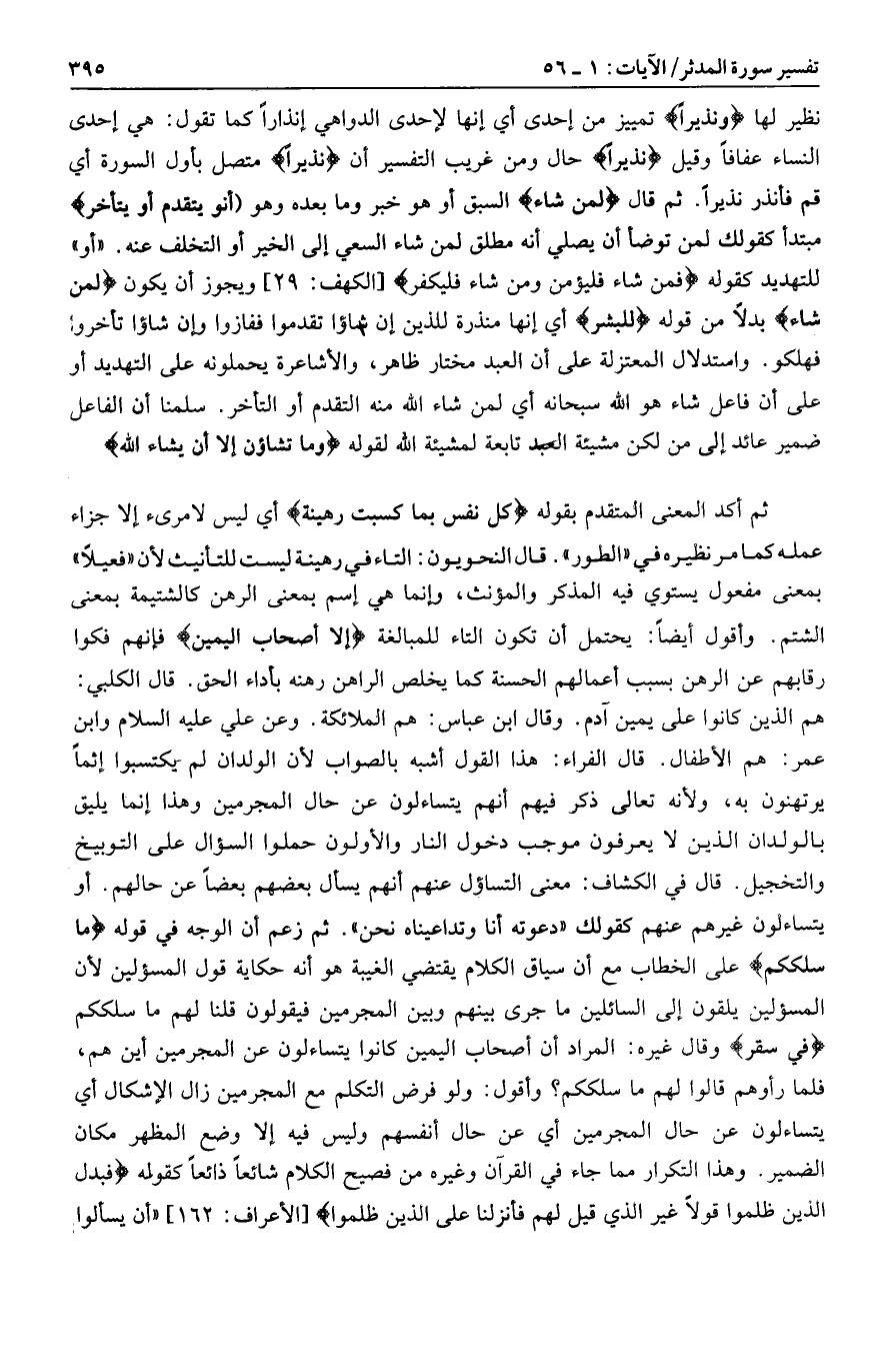نظير لها ونَذِيراً تمييز من إحدى أي إنها لإحدى الدواهي إنذارا كما تقول: هي إحدى النساء عفافا وقيل نَذِيراً حال ومن غريب التفسير أن نَذِيراً متصل بأول السورة أي قم فأنذر نذيرا. ثم قال لِمَنْ شاءَ السبق أو هو خبر وما بعده وهو أَنْ يَتَقَدَّمَ أَوْ يَتَأَخَّرَ مبتدأ كقولك لمن توضأ أن يصلي أنه مطلق لمن شاء السعي إلى الخير أو التخلف عنه. «أو» للتهديد كقوله فَمَنْ شاءَ فَلْيُؤْمِنْ وَمَنْ شاءَ فَلْيَكْفُرْ [الكهف: 29] ويجوز أن يكون لِمَنْ شاءَ بدلا من قوله لِلْبَشَرِ أي إنها منذرة للذين إن شاؤا تقدموا ففازوا وإن شاؤا تأخروا فهلكو. واستدلال المعتزلة على أن العبد مختار ظاهر، والأشاعرة يحملونه على التهديد أو على أن فاعل شاء هو الله سبحانه أي لمن شاء الله منه التقدم أو التأخر. سلمنا أن الفاعل ضمير عائد إلى من لكن مشيئة العبد تابعة لمشيئة الله لقوله وَما تَشاؤُنَ إِلَّا أَنْ يَشاءَ اللَّهُ ثم أكد المعنى المتقدم بقوله كُلُّ نَفْسٍ بِما كَسَبَتْ رَهِينَةٌ أي ليس لامرئ إلا جزاء عمله كما مر نظيره في «الطور» . قال النحويون: التاء في رهينة ليست للتأنيث لأن «فعيلا» بمعنى مفعول يستوي فيه المذكر والمؤنث، وإنما هي اسم بمعنى الرهن كالشتيمة بمعنى الشتم. وأقول أيضا: يحتمل أن تكون التاء للمبالغة إِلَّا أَصْحابَ الْيَمِينِ فإنهم فكوا رقابهم عن الرهن بسبب أعمالهم الحسنة كما يخلص الراهن رهنه بأداء الحق. قال الكلبي: