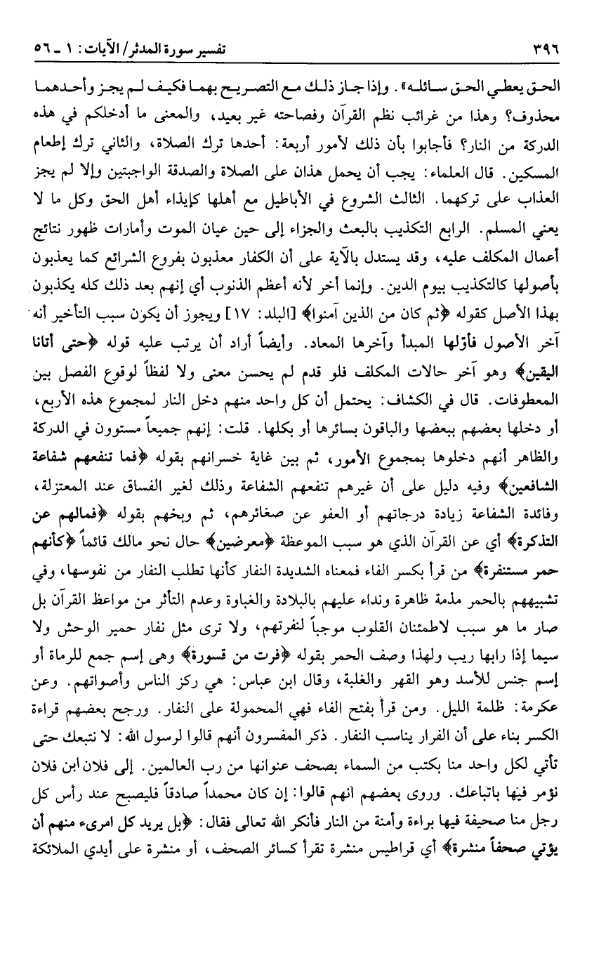 الحق يعطي الحق سائله» . وإذا جاز ذلك مع التصريح بهما فكيف لم يجز وأحدهما محذوف؟ وهذا من غرائب نظم القرآن وفصاحته غير بعيد، والمعنى ما أدخلكم في هذه الدركة من النار؟ فأجابوا بأن ذلك لأمور أربعة: أحدها ترك الصلاة، والثاني ترك إطعام المسكين. قال العلماء: يجب أن يحمل هذان على الصلاة والصدقة الواجبتين وإلا لم يجز العذاب على تركهما. الثالث الشروع في الأباطيل مع أهلها كإيذاء أهل الحق وكل ما لا يعني المسلم. الرابع التكذيب بالبعث والجزاء إلى حين عيان الموت وأمارات ظهور نتائج أعمال المكلف عليه، وقد يستدل بالآية على أن الكفار معذبون بفروع الشرائع كما يعذبون بأصولها كالتكذيب بيوم الدين. وإنما أخر لأنه أعظم الذنوب أي إنهم بعد ذلك كله يكذبون بهذا الأصل كقوله ثُمَّ كانَ مِنَ الَّذِينَ آمَنُوا [البلد: 17] ويجوز أن يكون سبب التأخير أنه آخر الأصول فأوّلها المبدأ وآخرها المعاد. وأيضا أراد أن يرتب عليه قوله حَتَّى أَتانَا الْيَقِينُ وهو آخر حالات المكلف فلو قدم لم يحسن معنى ولا لفظا لوقوع الفصل بين المعطوفات. قال في الكشاف: يحتمل أن كل واحد منهم دخل النار لمجموع هذه الأربع، أو دخلها بعضهم ببعضها والباقون بسائرها أو بكلها. قلت: إنهم جميعا مستوون في الدركة والظاهر أنهم دخلوها بمجموع الأمور، ثم بين غاية خسرانهم بقوله فَما تَنْفَعُهُمْ شَفاعَةُ الشَّافِعِينَ وفيه دليل على أن غيرهم تنفعهم الشفاعة وذلك لغير الفساق عند المعتزلة، وفائدة الشفاعة زيادة درجاتهم أو العفو عن صغائرهم، ثم وبخهم بقوله فَما لَهُمْ عَنِ التَّذْكِرَةِ أي عن القرآن الذي هو سبب الموعظة مُعْرِضِينَ حال نحو مالك قائما كَأَنَّهُمْ حُمُرٌ مُسْتَنْفِرَةٌ من قرأ بكسر الفاء فمعناه الشديدة النفار كأنها تطلب النفار من نفوسها، وفي تشبيههم بالحمر مذمة ظاهرة ونداء عليهم بالبلادة والغباوة وعدم التأثر من مواعظ القرآن بل صار ما هو سبب لاطمئنان القلوب موجبا لنفرتهم، ولا ترى مثل نفار حمير الوحش ولا سيما إذا رابها ريب ولهذا وصف الحمر بقوله فَرَّتْ مِنْ قَسْوَرَةٍ وهى اسم جمع للرماة أو اسم جنس للأسد وهو القهر والغلبة، وقال ابن عباس: هي ركز الناس وأصواتهم. وعن عكرمة: ظلمة الليل. ومن قرأ بفتح الفاء فهي المحمولة على النفار. ورجح بعضهم قراءة الكسر بناء على أن الفرار يناسب النفار. ذكر المفسرون أنهم قالوا لرسول الله: لا نتبعك حتى تأتي لكل واحد منا بكتب من السماء بصحف عنوانها من رب العالمين. إلى فلان ابن فلان نؤمر فيها باتباعك. وروى بعضهم انهم قالوا: إن كان محمدا صادقا فليصبح عند رأس كل رجل منا صحيفة فيها براءة وأمنة من النار فأنكر الله تعالى فقال: بَلْ يُرِيدُ كُلُّ امْرِئٍ مِنْهُمْ أَنْ يُؤْتى صُحُفاً مُنَشَّرَةً أي قراطيس منشرة تقرأ كسائر الصحف، أو منشرة على أيدي الملائكة