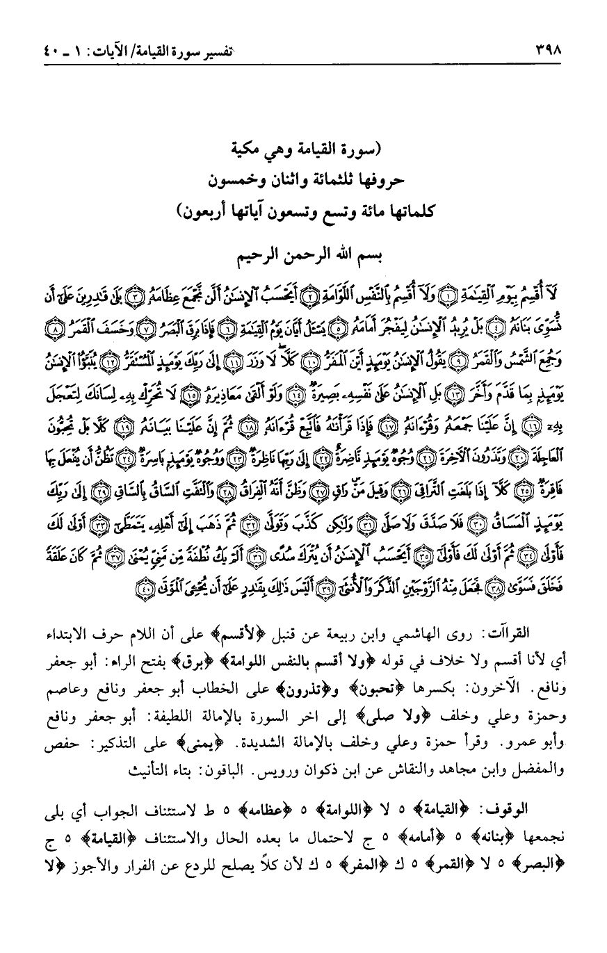 روى الهاشمي وابن ربيعة عن قنبل لأقسم على أن اللام حرف الابتداء أي لأنا أقسم ولا خلاف في قوله وَلا أُقْسِمُ بِالنَّفْسِ اللَّوَّامَةِ برق بفتح الراء: أبو جعفر ونافع. الآخرون: بكسرها تُحِبُّونَ وتَذَرُونَ على الخطاب أبو جعفر ونافع وعاصم وحمزة وعلي وخلف وَلا صَلَّى إلى اخر السورة بالإمالة اللطيفة: أبو جعفر ونافع وأبو عمرو. وقرأ حمزة وعلي وخلف بالإمالة الشديدة. يُمْنى على التذكير: حفص والمفضل وابن مجاهد والنقاش عن ابن ذكوان ورويس. الباقون: بتاء التأنيث.