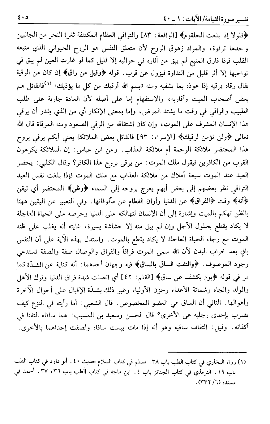 فَلَوْلا إِذا بَلَغَتِ الْحُلْقُومَ [الواقعة: 83] والتراقي العظام المكتنفة ثغرة النحر من الجانبين واحدها ترقوة، والمراد زهوق الروح لأن متعلق النفس هو الروح الحيواني الذي منبعه القلب فإذا فارق المنبع لم يبق من آثاره في حواليه إلا قليل كما لو غارت العين لم يبق في نواحيها إلا أثر قليل من النداوة فيزول عن قرب. قوله وَقِيلَ مَنْ راقٍ