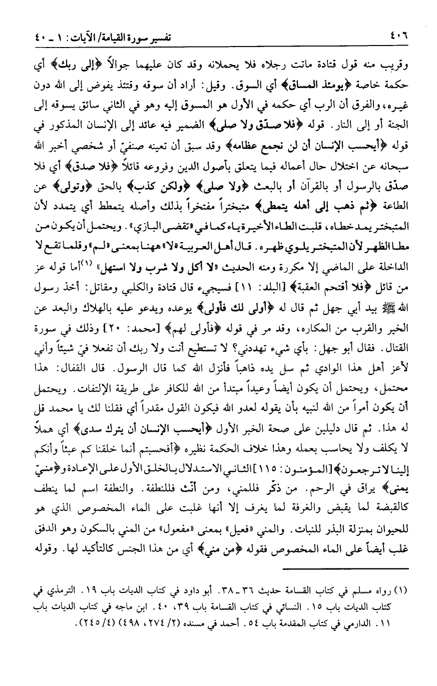 قال القفال: هذا محتمل، ويحتمل أن يكون أيضا وعيدا مبتدأ من الله للكافر على طريقة الالتفات. ويحتمل أن يكون أمرا من الله لنبيه بأن يقوله لعدو الله فيكون القول مقدرا أي فقلنا لك يا محمد قل له هذا. ثم قال دليلين على صحة الخبر الأول أَيَحْسَبُ الْإِنْسانُ أَنْ يُتْرَكَ سُدىً أي هملا لا يكلف ولا يحاسب بعمله وهذا خلاف الحكمة نظيره أَفَحَسِبْتُمْ أَنَّما خَلَقْناكُمْ عَبَثاً وَأَنَّكُمْ إِلَيْنا لا تُرْجَعُونَ [المؤمنون: 115] الثاني الاستدلال بالخلق الأول على الإعادة ومَنِيٍّ يُمْنى يراق في الرحم. من ذكّر فللمني، ومن أنّث فللنطفة. والنطفة اسم لما ينطف كالقبضة لما يقبض والغرفة لما يغرف إلا أنها غلبت على الماء المخصوص الذي هو للحيوان بمنزلة البذر للنبات. والمني «فعيل» بمعنى «مفعول» من المني بالسكون وهو الدفق غلب أيضا على الماء المخصوص فقوله مِنْ مَنِيٍّ أي من هذا الجنس كالتأكيد لها. وقوله