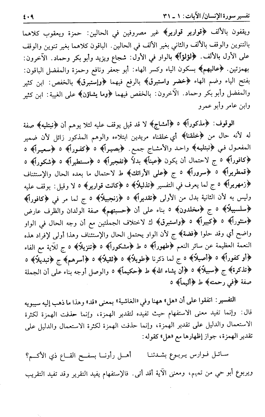 مَذْكُوراً هـ أَمْشاجٍ لا قد قيل يوقف عليه لئلا يوهم أن نَبْتَلِيهِ صفة له لأنه حال من خَلَقْنَا أي خلقناه مريدين ابتلاءه والوهم المذكور زائل لأن ضمير المفعول في نَبْتَلِيهِ واحد والأمشاج جمع. بَصِيراً هـ كَفُوراً هـ سَعِيراً هـ كافُوراً هـ ج لاحتمال أن يكون عَيْناً بدلا تَفْجِيراً هـ مُسْتَطِيراً هـ شُكُوراً هـ قَمْطَرِيراً هـ سُرُوراً هـ ج عَلَى الْأَرائِكِ ط لاحتمال ما بعده الحال والاستئناف زَمْهَرِيراً هـ ج لما يعرف في التفسير تَذْلِيلًا هـ كانت قوارير هـ لا وقيل: بوقف عليه وليس به لأن الثانية بدل من الأولى تَقْدِيراً هـ زَنْجَبِيلًا هـ ج لما مر في كافُوراً سَلْسَبِيلًا هـ ج مُخَلَّدُونَ هـ بناء على أن حَسِبْتَهُمْ صفة الولدان والظرف عارض مَنْثُوراً هـ كَبِيراً هـ وَإِسْتَبْرَقٌ ك لاختلاف الجملتين مع أن وجه الحال في الواو واضح أي وقد حلوا فِضَّةٍ ج لأن الواو يحتمل الحال والاستئناف وهذا أولى لإفراد هذه النعمة العظيمة عن سائر النعم طَهُوراً هـ ط مَشْكُوراً هـ تَنْزِيلًا هـ ج للآية مع الفاء أَوْ كَفُوراً هـ أَصِيلًا هـ ج لما ذكرنا طَوِيلًا هـ ثَقِيلًا هـ أَسْرَهُمْ ج تَبْدِيلًا هـ تَذْكِرَةٌ ج سَبِيلًا هـ أَنْ يَشاءَ اللَّهُ ط حَكِيماً هـ والوصل أوجه بناء على أن الجملة صفة فِي رَحْمَتِهِ ط أَلِيماً هـ