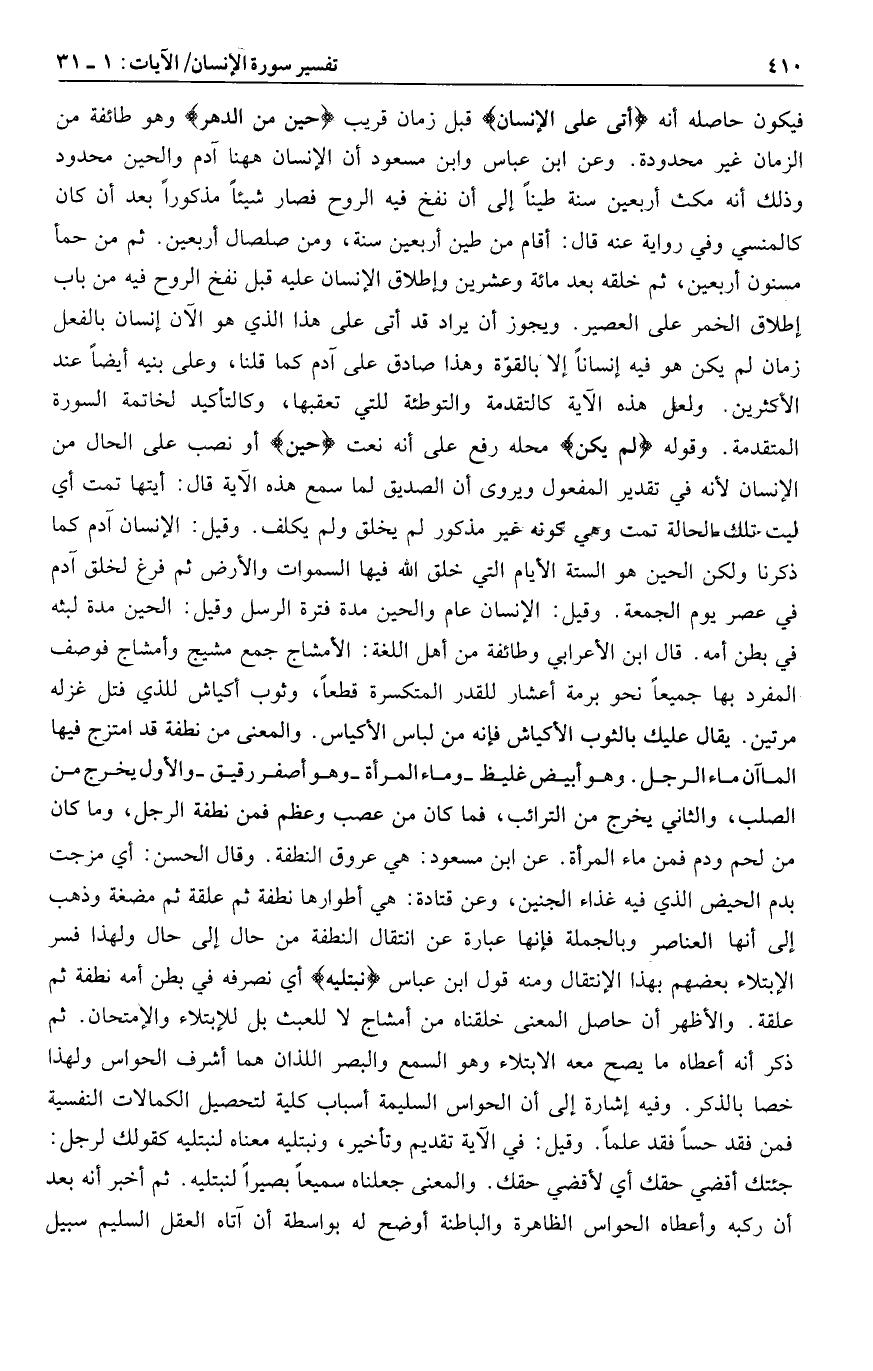 فيكون حاصله أنه أَتى عَلَى الْإِنْسانِ قبل زمان قريب حِينٌ مِنَ الدَّهْرِ وهو طائفة من الزمان غير محدودة. وعن ابن عباس وابن مسعود أن الإنسان هاهنا آدم والحين محدود وذلك أنه مكث أربعين سنة طينا إلى أن نفخ فيه الروح فصار شيئا مذكورا بعد أن كان كالمنسي وفي رواية عنه قال: أقام من طين أربعين سنة، ومن صلصال أربعين. ثم من حمأ مسنون أربعين، ثم خلقه بعد مائة وعشرين وإطلاق الإنسان عليه قبل نفخ الروح فيه من باب إطلاق الخمر على العصير. ويجوز أن يراد قد أتى على هذا الذي هو الآن إنسان بالفعل زمان لم يكن هو فيه إنسانا إلا بالقوّة وهذا صادق على آدم كما قلنا، وعلى بنيه أيضا عند الأكثرين. ولعل هذه الآية كالتقدمة والتوطئة للتي تعقبها، وكالتأكيد لخاتمة السورة المتقدمة. وقوله لَمْ يَكُنْ محله رفع على أنه نعت حِينٌ أو نصب على الحال من الإنسان لأنه في تقدير المفعول ويروى أن الصديق لما سمع هذه الآية قال: أيتها تمت أي ليت تلك الحالة تمت وهي كونه غير مذكور لم يخلق ولم يكلف. وقيل: الإنسان آدم كما ذكرنا ولكن الحين هو الستة الأيام التي خلق الله فيها السموات والأرض ثم فرغ لخلق آدم في عصر يوم الجمعة. وقيل: الإنسان عام والحين مدة فترة الرسل وقيل: الحين مدة لبثه في بطن أمه. قال ابن الأعرابي وطائفة من أهل اللغة: الأمشاج جمع مشيج وأمشاج فوصف المفرد بها جميعا نحو برمة أعشار للقدر المتكسرة قطعا، وثوب أكياش للذي فتل غزله مرتين. يقال عليك بالثوب الأكياش فإنه من لباس الأكياس. والمعنى من نطفة قد امتزج فيها الماءان ماء الرجل. وهو أبيض غليظ- وماء المرأة- وهو أصفر رقيق- والأول يخرج من الصلب، والثاني يخرج من الترائب، فما كان من عصب وعظم فمن نطفة الرجل، وما كان من لحم ودم فمن ماء المرأة. عن ابن مسعود: هي عروق النطفة. وقال الحسن: أي مزجت بدم الحيض الذي فيه غذاء الجنين، وعن قتادة: هي أطوارها نطفة ثم علقة ثم مضغة وذهب إلى أنها العناصر وبالجملة فإنها عبارة عن انتقال النطفة من حال إلى حال ولهذا فسر الابتلاء بعضهم بهذا الانتقال ومنه قول ابن عباس نَبْتَلِيهِ أي نصرفه في بطن أمه نطفة ثم علقة. والأظهر أن حاصل المعنى خلقناه من أمشاج لا للعبث بل للإبتلاء والامتحان. ثم ذكر أنه أعطاه ما يصح معه الابتلاء وهو السمع والبصر اللذان هما أشرف الحواس ولهذا خصا بالذكر. وفيه إشارة إلى أن الحواس السليمة أسباب كلية لتحصيل الكمالات النفسية فمن فقد حسا فقد علما. وقيل: في الآية تقديم وتأخير، ونبتليه معناه لنبتليه كقولك لرجل: