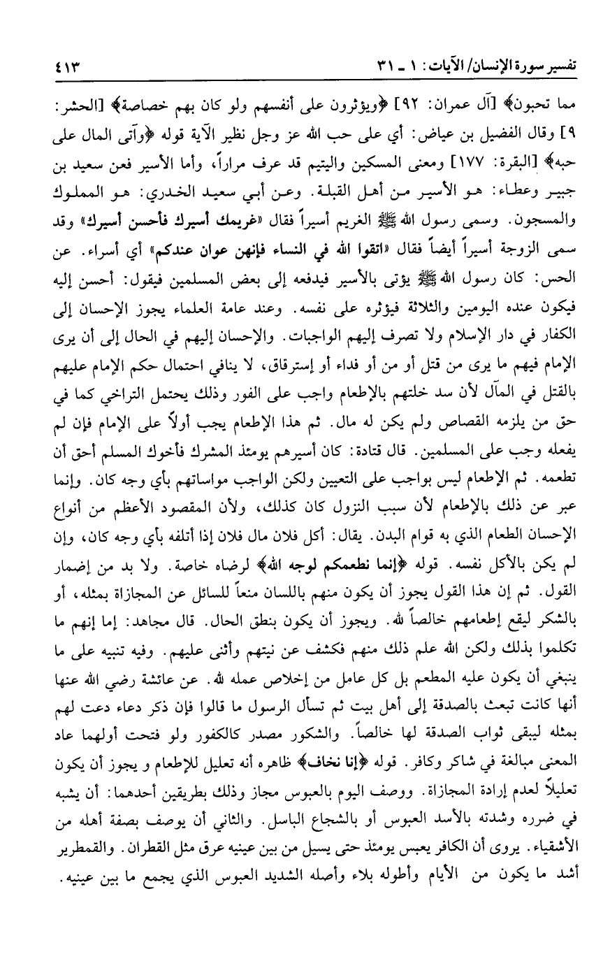 وعند عامة العلماء يجوز الإحسان إلى الكفار في دار الإسلام ولا تصرف إليهم الواجبات. والإحسان إليهم في الحال إلى أن يرى الإمام فيهم ما يرى من قتل أو من أو فداء أو استرقاق، لا ينافي احتمال حكم الإمام عليهم بالقتل في المآل لأن سد خلتهم بالإطعام واجب على الفور وذلك يحتمل التراخي كما في حق من يلزمه القصاص ولم يكن له مال. ثم هذا الإطعام يجب أولا على الإمام فإن لم يفعله وجب على المسلمين. قال قتادة: كان أسيرهم يومئذ المشرك فأخوك المسلم أحق أن تطعمه. ثم الإطعام ليس بواجب على التعيين ولكن الواجب مواساتهم بأي وجه كان. وإنما عبر عن ذلك بالإطعام لأن سبب النزول كان كذلك، ولأن المقصود الأعظم من أنواع الإحسان الطعام الذي به قوام البدن. يقال: أكل فلان مال فلان إذا أتلفه بأي وجه كان، وإن لم يكن بالأكل نفسه. قوله إِنَّما نُطْعِمُكُمْ لِوَجْهِ اللَّهِ لرضاه خاصة. ولا بد من إضمار القول. ثم إن هذا القول يجوز أن يكون منهم باللسان منعا للسائل عن المجازاة بمثله، أو بالشكر ليقع إطعامهم خالصا لله. ويجوز أن يكون بنطق الحال. قال مجاهد: إما إنهم ما تكلموا بذلك ولكن الله علم ذلك منهم فكشف عن نيتهم وأثنى عليهم. وفيه تنبيه على ما ينبغي أن يكون عليه المطعم بل كل عامل من إخلاص عمله لله. عن عائشة رضي الله عنها أنها كانت تبعث بالصدقة إلى أهل بيت ثم تسأل الرسول ما قالوا فإن ذكر دعاء دعت لهم بمثله ليبقى ثواب الصدقة لها خالصا. والشكور مصدر كالكفور ولو فتحت أولهما عاد المعنى مبالغة في شاكر وكافر. قوله إِنَّا نَخافُ ظاهره أنه تعليل للإطعام ويجوز أن يكون تعليلا لعدم إرادة المجازاة. ووصف اليوم بالعبوس مجاز وذلك بطريقين أحدهما: أن يشبه في ضرره وشدته بالأسد العبوس أو بالشجاع الباسل. والثاني أن يوصف بصفة أهله من الأشقياء.
