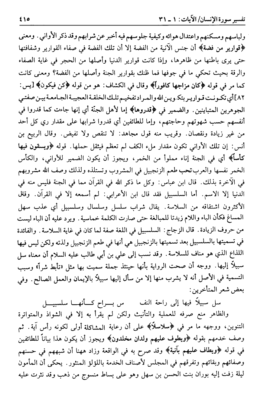 82] أي تكونت قوارير بتكوين الله والمراد تفخيم تلك الخلقة العجيبة الجامعة بين صفتي الجوهرين المتباينين. والضمير في قَدَّرُوها إما لأهل الجنّة أي إنها جاءت كما قدروا في أنفسهم حسب شهوتهم وحاجتهم، وإما للطائفين أي قدروا شرابها على مقدار ري كل أحد من غير زيادة ونقصان. وقريب منه قول مجاهد: لا تنقص ولا تفيض. وقال الربيع بن أنس: إن تلك الأواني تكون مقدار ملء الكف لم تعظم فيثقل حملها. قوله وَيُسْقَوْنَ فِيها كَأْساً أي في الجنة إناء مملوأ من الخمر، ويجوز أن يكون الضمير للأواني، والكأس الخمر نفسها والعرب تحب طعم الزنجبيل في المشروب وتستلذه ولذلك وصف الله مشروبهم في الآخرة بذلك. قال ابن عباس: وكل ما ذكر الله في القرآن مما في الجنة فليس منه في الدنيا إلا الاسم. أما السلسبيل فقد قال ابن الأعرابي: لم أسمعه إلا في القرآن. وقال الأكثرون اشتقاقه من السلاسة. يقال شراب سلسل وسلسال وسلسبيل أي عذب سهل المساغ فكأن الباء واللام زيدتا للمبالغة حتى صارت الكلمة خماسية. ويرد عليه أن الباء ليست من حروف الزيادة. قال الزجاج: السلسبيل في اللغة صفة لما كان في غاية السلاسة. والفائدة في تسميتها بالسلسبيل بعد تسميتها بالزنجبيل هي أنها في طعم الزنجبيل ولذته ولكن ليس فيها اللذاع الذي هو مناف للسلاسة.