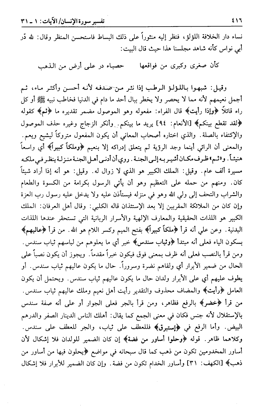 وكلاهما ظاهر. قوله وَحُلُّوا أَساوِرَ مِنْ فِضَّةٍ إن كان الضمير للولدان فلا إشكال لأن أساور المخدومين تكون من ذهب كما قال سبحانه في مواضع يُحَلَّوْنَ فِيها مِنْ أَساوِرَ مِنْ ذَهَبٍ [الكهف: 31] وأساور الخدام تكون من فضة. وإن كان الضمير للأبرار فلا إشكال