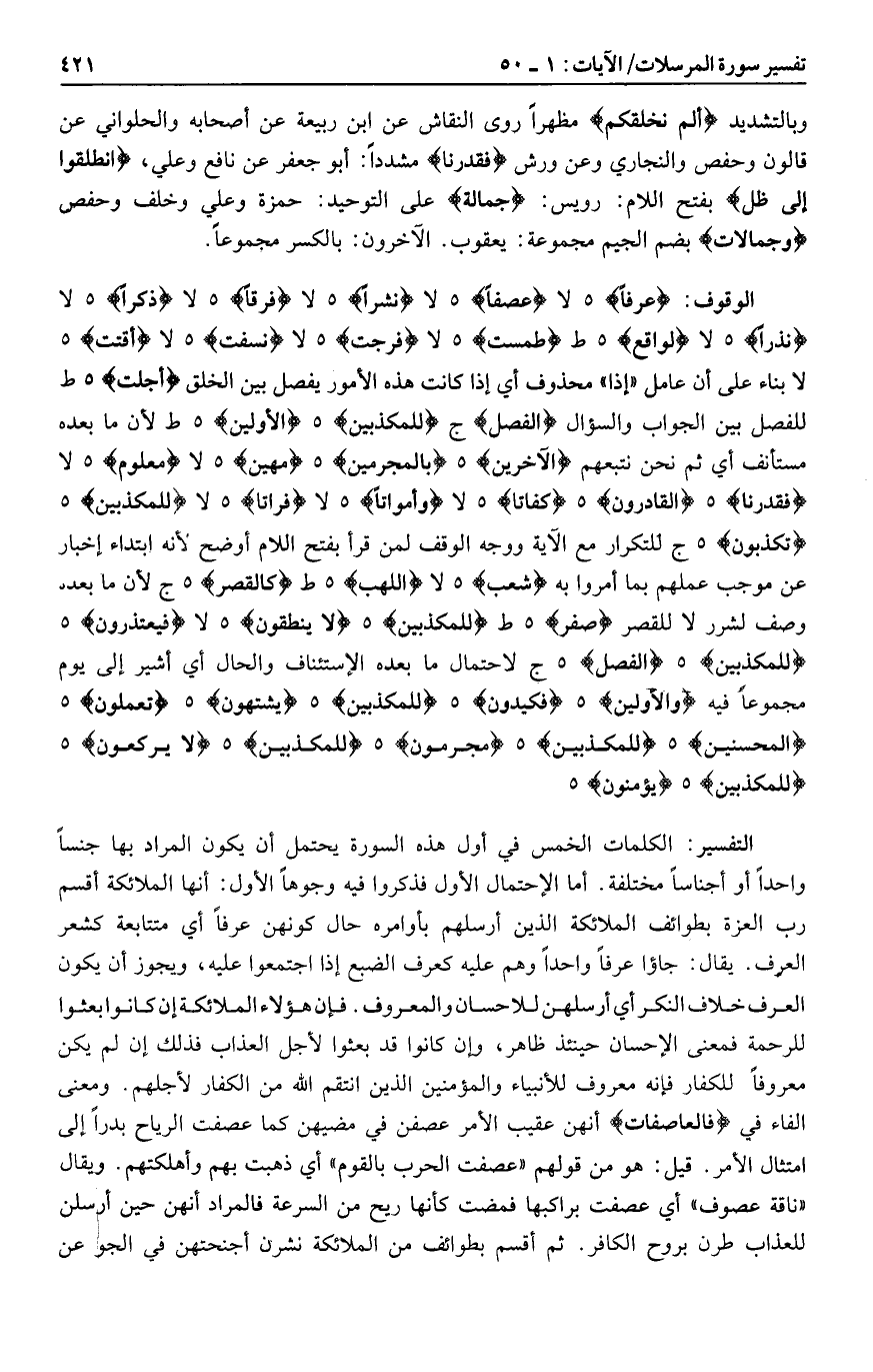 عُرْفاً هـ لا عَصْفاً هـ لا نَشْراً هـ لا فَرْقاً هـ لا ذِكْراً هـ لا نُذْراً هـ لا لَواقِعٌ هـ ط طُمِسَتْ هـ لا فُرِجَتْ هـ لا نُسِفَتْ هـ لا أُقِّتَتْ هـ لا بناء على أن عامل «إذا» محذوف أي إذا كانت هذه الأمور يفصل بين الخلق أُجِّلَتْ هـ ط للفصل بين الجواب والسؤال الْفَصْلِ ج لِلْمُكَذِّبِينَ هـ الْأَوَّلِينَ هـ ط لأن ما بعده مستأنف أي ثم نحن نتبعهم الْآخِرِينَ هـ بِالْمُجْرِمِينَ هـ مَهِينٍ هـ لا مَعْلُومٍ هـ لا فَقَدَرْنا هـ الْقادِرُونَ هـ كِفاتاً هـ لا وَأَمْواتاً هـ لا فُراتاً هـ لا لِلْمُكَذِّبِينَ هـ تُكَذِّبُونَ هـ ج للتكرار مع الآية ووجه الوقف لمن قرأ بفتح اللام أوضح لأنه ابتداء إخبار عن موجب عملهم بما أمروا به شُعَبٍ هـ لا اللَّهَبِ هـ ط كَالْقَصْرِ هـ ج لأن ما بعده وصف لشرر لا للقصر صُفْرٌ هـ ط لِلْمُكَذِّبِينَ هـ لا يَنْطِقُونَ هـ لا فَيَعْتَذِرُونَ هـ لِلْمُكَذِّبِينَ هـ الْفَصْلِ هـ ج لاحتمال ما بعده الاستئناف والحال أي أشير إلى يوم مجموعا فيه وَالْأَوَّلِينَ هـ فَكِيدُونِ هـ لِلْمُكَذِّبِينَ هـ يَشْتَهُونَ هـ تَعْمَلُونَ هـ الْمُحْسِنِينَ هـ لِلْمُكَذِّبِينَ هـ مُجْرِمُونَ هـ لِلْمُكَذِّبِينَ هـ لا يَرْكَعُونَ هـ لِلْمُكَذِّبِينَ هـ يُؤْمِنُونَ هـ
