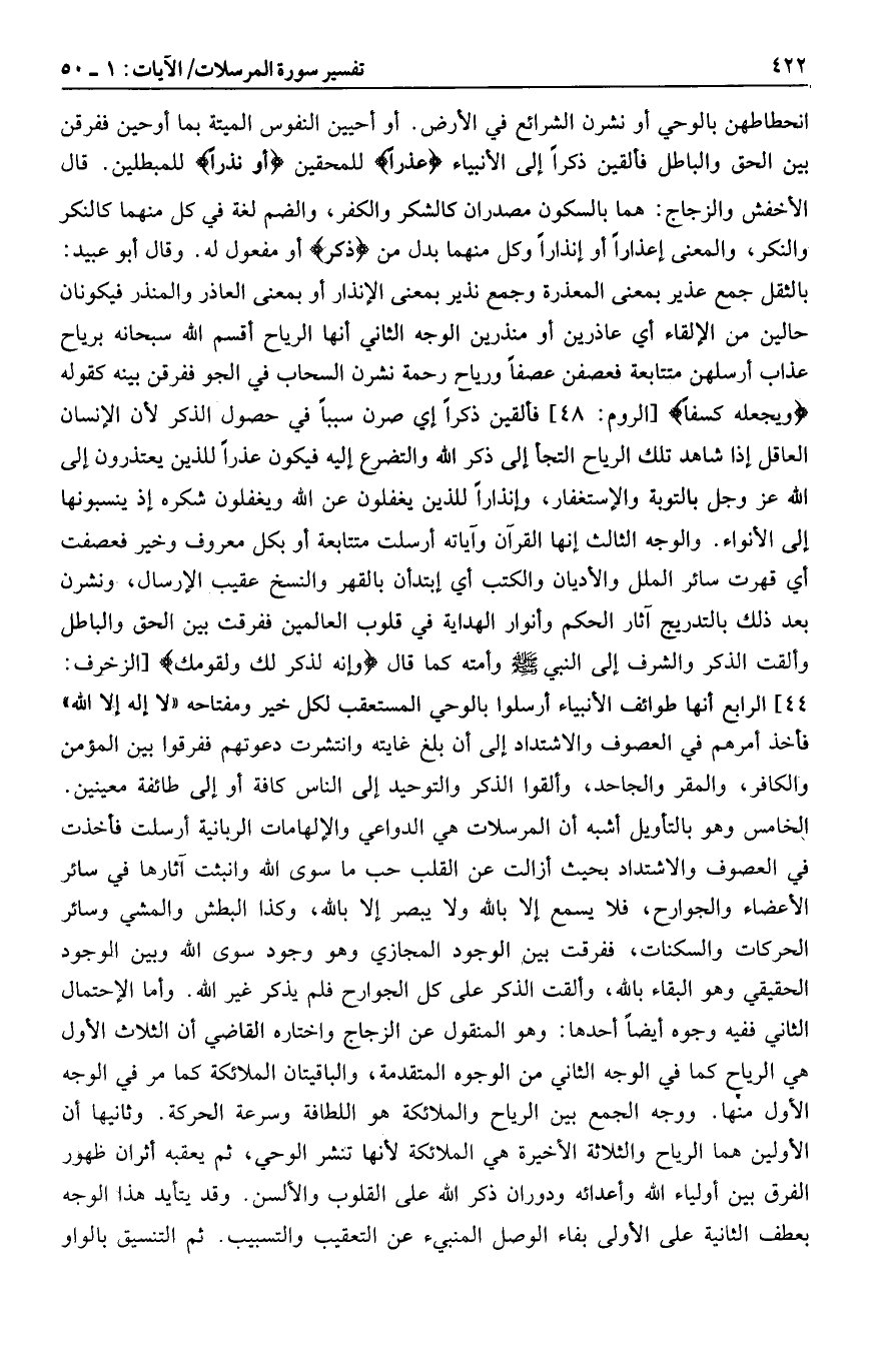 الخامس وهو بالتأويل أشبه أن المرسلات هي الدواعي والإلهامات الربانية أرسلت فأخذت في العصوف والاشتداد بحيث أزالت عن القلب حب ما سوى الله وانبثت آثارها في سائر الأعضاء والجوارح، فلا يسمع إلا بالله ولا يبصر إلا بالله، وكذا البطش والمشي وسائر الحركات والسكنات، ففرقت بين الوجود المجازي وهو وجود سوى الله وبين الوجود الحقيقي وهو البقاء بالله، وألقت الذكر على كل الجوارح فلم يذكر غير الله. وأما الاحتمال الثاني ففيه وجوه أيضا أحدها: وهو المنقول عن الزجاج واختاره القاضي أن الثلاث الأول هي الرياح كما في الوجه الثاني من الوجوه المتقدمة، والباقيتان الملائكة كما مر في الوجه الأول منها. ووجه الجمع بين الرياح والملائكة هو اللطافة وسرعة الحركة. وثانيها أن الأولين هما الرياح والثلاثة الأخيرة هي الملائكة لأنها تنشر الوحي، ثم يعقبه أثران ظهور الفرق بين أولياء الله وأعدائه ودوران ذكر الله على القلوب والألسن. وقد يتأيد هذا الوجه بعطف الثانية على الأولى بفاء الوصل المنبئ عن التعقيب والتسبيب. ثم التنسيق بالواو