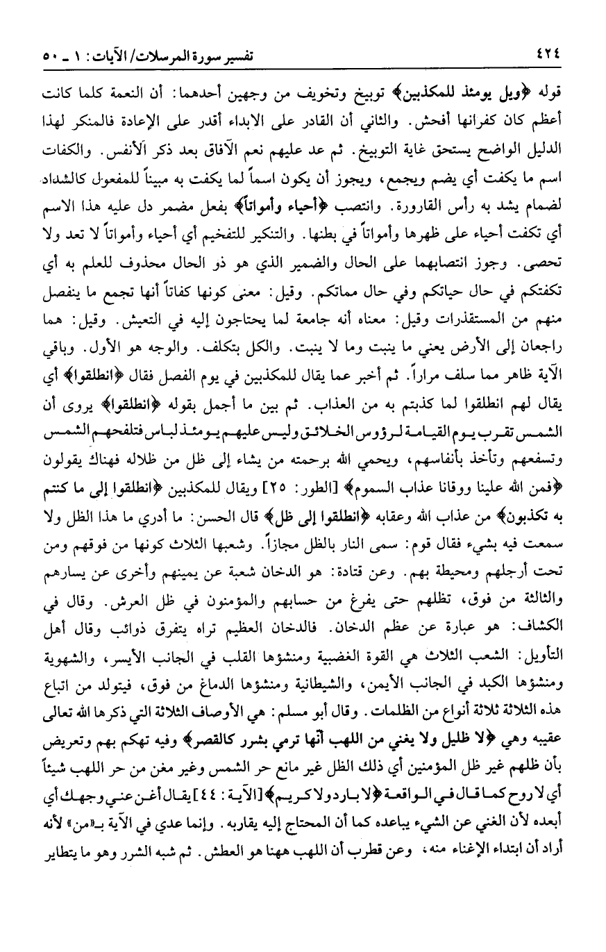 فهناك يقولون فَمَنَّ اللَّهُ عَلَيْنا وَوَقانا عَذابَ السَّمُومِ [الطور: 25] ويقال للمكذبين انْطَلِقُوا إِلى ما كُنْتُمْ بِهِ تُكَذِّبُونَ من عذاب الله وعقابه انْطَلِقُوا إِلى ظِلٍّ قال الحسن: ما أدري ما هذا الظل ولا سمعت فيه بشيء فقال قوم: سمى النار بالظل مجازا. وشعبها الثلاث كونها من فوقهم ومن تحت أرجلهم ومحيطة بهم. وعن قتادة: هو الدخان شعبة عن يمينهم وأخرى عن يسارهم والثالثة من فوق، تظلهم حتى يفرغ من حسابهم والمؤمنون في ظل العرش. وقال في الكشاف: هو عبارة عن عظم الدخان. فالدخان العظيم تراه يتفرق ذوائب وقال أهل