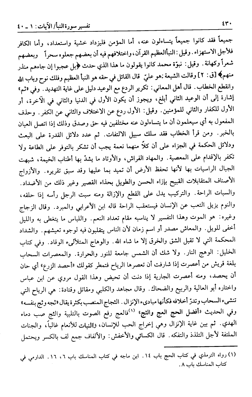 جميعا فقد كانوا جميعا يتساءلون عنه، أما المؤمن فليزداد خشية واستعداد، وأما الكافر فلأجل الاستهزاء. وقيل: النبأ العظيم القرآن، واختلافهم فيه أن بعضهم جعلوه سحرا وبعضهم شعرا وكهانة. وقيل: نبوّة محمد كانوا يقولون ما هذا الذي حدث بَلْ عَجِبُوا أَنْ جاءَهُمْ مُنْذِرٌ مِنْهُمْ [ق: 2] وقالت الشيعة: هو عليّ قال القائل في حقه هو النبأ العظيم وفلك نوح وباب الله وانقطع الخطاب. قال أهل المعاني: تكرير الردع مع الوعيد دليل على غاية التهديد. وفي «ثم» إشارة إلى أن الوعيد الثاني أبلغ، ويجوز أن يكون الأول في الدنيا والثاني في الآخرة، أو الأول للكفار والثاني للمؤمنين. وقيل: الأول ردع عن الاختلاف والثاني عن الكفر. وحذف المفعول به أي سيعلمون أن ما يتساءلون عنه مختلفين فيه حق وصدق وذلك إذا اتصل العيان بالخبر. ومن قرأ الخطاب فقد سلك سبيل الالتفات. ثم عدد دلائل القدرة على البعث ودلائل الحكمة في الجزاء على أن كلا منهما نعمة يجب أن تشكر بالتوفر على الطاعة ولا تكفر بالإقدام على المعصية. والمهاد الفراش، والأوتاد ما يشدّ بها أطناب الخيمة، شبهت الجبال الراسيات بها لأنها تحفظ الأرض أن تميد بما عليها وقد سبق تقريره. والأزواج الأصناف المتقابلات القبيح بإزاء الحسن والطويل بحذاء القصير وغير ذلك من الأضداد.