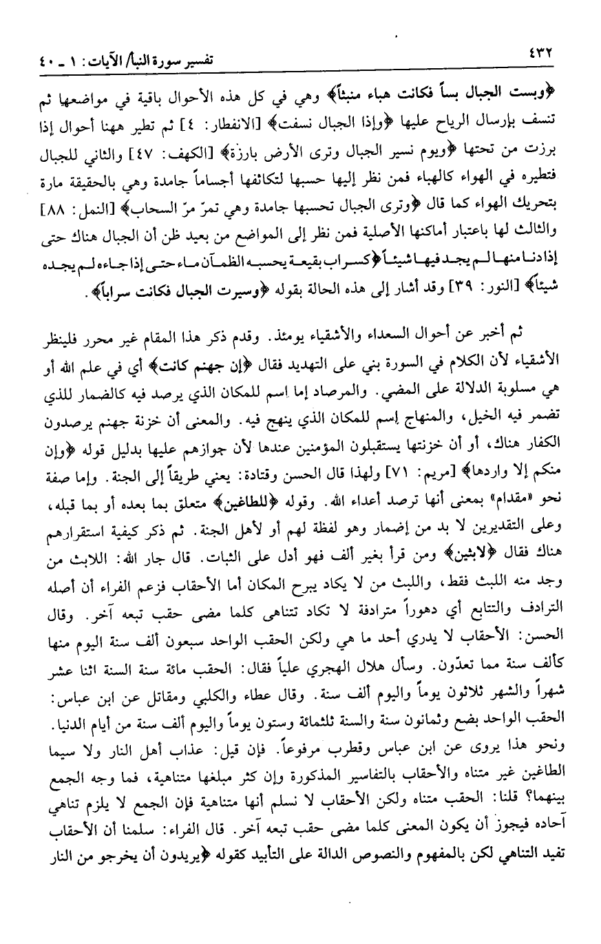 ونحو هذا يروى عن ابن عباس وقطرب مرفوعا. فإن قيل: عذاب أهل النار ولا سيما الطاغين غير متناه والأحقاب بالتفاسير المذكورة وإن كثر مبلغها متناهية، فما وجه الجمع بينهما؟ قلنا: الحقب متناه ولكن الأحقاب لا نسلم أنها متناهية فإن الجمع لا يلزم تناهي آحاده فيجوز أن يكون المعنى كلما مضى حقب تبعه آخر. قال الفراء: سلمنا أن الأحقاب تفيد التناهي لكن بالمفهوم والنصوص الدالة على التأبيد كقوله يُرِيدُونَ أَنْ يَخْرُجُوا مِنَ النَّارِ