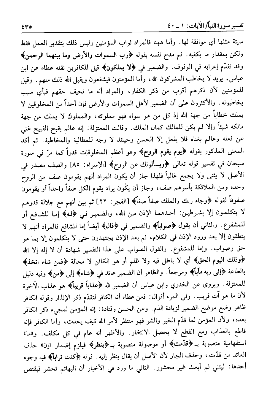 سيئة مثلها أي موافقة لها. وأما هاهنا فالمراد ثواب المؤمنين وليس ذلك بتقدير العمل فقط ولكن بمقدار ما يكفيه. ثم مدح نفسه بقوله رَبِّ السَّماواتِ وَالْأَرْضِ وَما بَيْنَهُمَا الرَّحْمنِ وقد تقدّم إعرابه في الوقوف. والضمير في لا يَمْلِكُونَ قيل للكافرين نقله عطاء عن ابن عباس، يريد لا يخاطب المشركون الله، وأما المؤمنون فيشفعون ويقبل الله ذلك منهم. وقيل للمؤمنين لأن ذكرهم أقرب من ذكر الكفار، والمراد أنه ما تحيف حقهم فبأي سبب يخاطبونه. والأكثرون على أن الضمير لأهل السموات والأرض فإن أحدا من المخلوقين لا يملك خطابا من جهة الله إذ كل من هو سواه فهو مملوكه، والمملوك لا يملك من جهة مالكه شيئا وإلا لم يكن للمالك كمال الملك. وقالت المعتزلة: إنه عالم بقبح القبيح غني عن فعله وعالم بغناه فلا يفعل إلا الحسن وحينئذ لا وجه للمطالبة والمخاطبة. ثم أكد المعنى المذكور بقوله يَوْمَ يَقُومُ الرُّوحُ وهو أعظم المخلوقات قدرا كما مرّ في سورة سبحان في تفسير قوله تعالى وَيَسْئَلُونَكَ عَنِ الرُّوحِ [الإسراء: 85] والصف مصدر في الأصل لا يثنى ولا يجمع غالبا فلهذا جاز أن يكون المراد أنهم يقومون صف من الروح وحده ومن الملائكة بأسرهم صف، وجاز أن يكون يراد يقوم الكل صفا واحدا أو يقومون صفوفا لقوله وَجاءَ رَبُّكَ وَالْمَلَكُ صَفًّا صَفًّا [الفجر: 22] ثم بين أنهم مع جلالة قدرهم لا يتكلمون إلا بشرطين: أحدهما الإذن من الله، والضمير في لَهُ إما للشافع أو للمشفوع. والثاني أن يقول صَواباً والضمير في قالَ أيضا إما للشافع فالمراد أنهم لا ينطقون إلا بعد ورود الإذن في الكلام، ثم بعد الإذن يجتهدون حتى لا يتكلمون إلا بما هو حق وصواب. وإما للمشفوع. والقول الصواب على هذا التفسير شهادة أن لا إله إلا الله وذلِكَ الْيَوْمُ الْحَقُّ أي لا باطل فيه ولا ظلم أو هو الكائن لا محالة فَمَنْ شاءَ اتَّخَذَ بالطاعة إِلى رَبِّهِ مَآباً ومرجعا. والظاهر أن الضمير عائد في شاءَ إلى فَمَنْ وفيه دليل للمعتزلة. ويروى عن الخدري وابن عباس أن الضمير لله ذاباً قَرِيباً