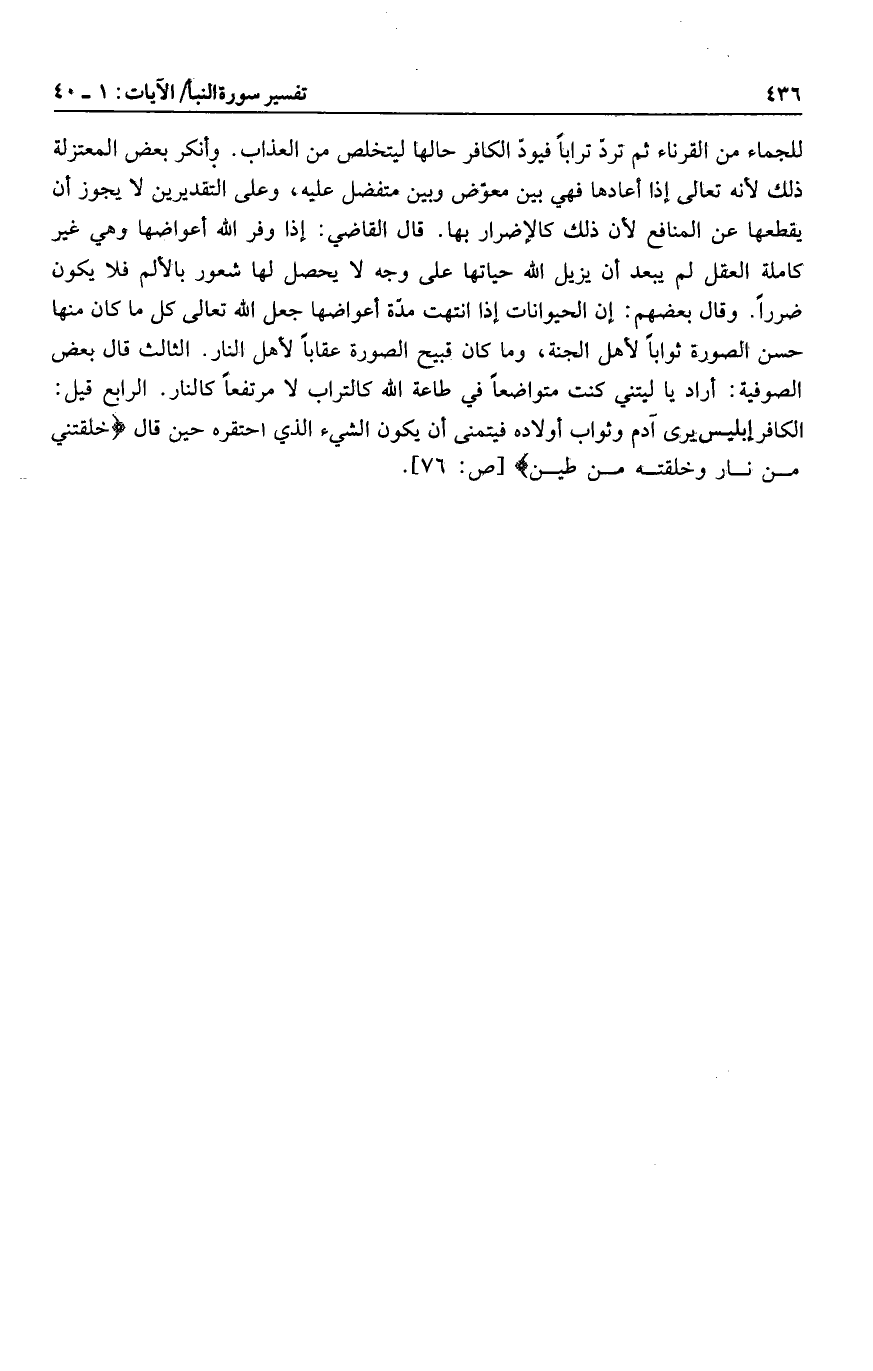 وأنكر بعض المعتزلة ذلك لأنه تعالى إذا أعادها فهي بين معوّض وبين متفضل عليه، وعلى التقديرين لا يجوز أن يقطعها عن المنافع لأن ذلك كالإضرار بها. قال القاضي: إذا وفر الله أعواضها وهي غير كاملة العقل لم يبعد أن يزيل الله حياتها على وجه لا يحصل لها شعور بالألم فلا يكون ضررا. وقال بعضهم: إن الحيوانات إذا انتهت مدّة أعواضها جعل الله تعالى كل ما كان منها حسن الصورة ثوابا لأهل الجنة، وما كان قبيح الصورة عقابا لأهل النار. الثالث قال بعض الصوفية: أراد يا ليتني كنت متواضعا في طاعة الله كالتراب لا مرتفعا كالنار. الرابع قيل: