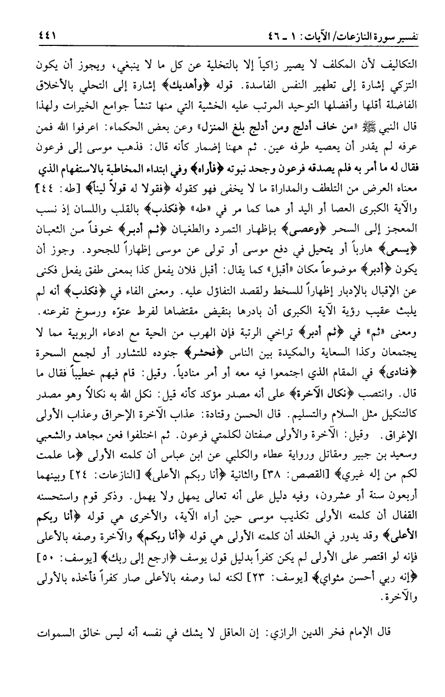 ومعنى «ثم» في ثُمَّ أَدْبَرَ تراخي الرتبة فإن الهرب من الحية مع ادعاء الربوبية مما لا يجتمعان وكذا السعاية والمكيدة بين الناس فَحَشَرَ جنوده للتشاور أو لجمع السحرة فَنادى في المقام الذي اجتمعوا فيه معه أو أمر مناديا. وقيل: قام فيهم خطيبا فقال ما قال. وانتصب نَكالَ الْآخِرَةِ على أنه مصدر مؤكد كأنه قيل: نكل الله به نكالا وهو مصدر كالتنكيل مثل السلام والتسليم. قال الحسن وقتادة: عذاب الآخرة الإحراق وعذاب الأولى الإغراق. وقيل: الآخرة والأولى صفتان لكلمتي فرعون. ثم اختلفوا فعن مجاهد والشعبي وسعيد بن جبير ومقاتل ورواية عطاء والكلبي عن ابن عباس أن كلمته الأولى ما عَلِمْتُ لَكُمْ مِنْ إِلهٍ غَيْرِي [القصص: 38] والثانية أَنَا رَبُّكُمُ الْأَعْلى [النازعات: 24] وبينهما أربعون سنة أو عشرون، وفيه دليل على أنه تعالى يمهل ولا يهمل. وذكر قوم واستحسنه القفال أن كلمته الأولى تكذيب موسى حين أراه الآية، والأخرى هي قوله أَنَا رَبُّكُمُ الْأَعْلى وقد يدور في الخلد أن كلمته الأولى هي قوله أَنَا رَبُّكُمُ والآخرة وصفه بالأعلى فإنه لو اقتصر على الأولى لم يكن كفرا بدليل قول يوسف ارْجِعْ إِلى رَبِّكَ [يوسف: 50] إِنَّهُ رَبِّي أَحْسَنَ مَثْوايَ [يوسف: 23] لكنه لما وصفه بالأعلى صار كفرا فأخذه بالأولى والآخرة.
