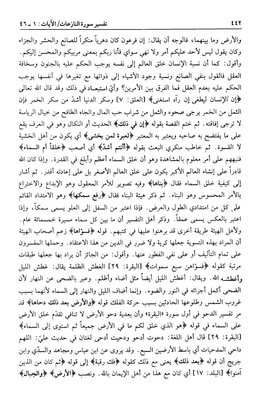 ولأهل الهيئة طريقة أخرى قد برهنوا عليها في كتبهم. قوله فَسَوَّاها زعم أصحاب الهيئة أن المراد بهذه التسوية جعلها كرية ولا ضرر في الدين من هذا الاعتقاد. وحملها المفسرون على تمام التأليف أو على نفي الفطور عنها. وأقول: من الجائز أن يراد بها جعلها طبقات مرتبة كقوله فَسَوَّاهُنَّ سَبْعَ سَماواتٍ [البقرة: 29] الغطش الظلمة يقال: غطش الليل وأغطشه الله. ويقال: أغطش الليل أيضا مثل أضاء وأظلم. وعبر بالضحى عن النهار لأن الضحى أكمل أجزائه في النور والضوء. وإنما أضاف الليل والنهار إلى السماء لأنهما بسبب غروب الشمس وطلوعها الحادثين بسبب حركة الفلك قوله وَالْأَرْضَ بَعْدَ ذلِكَ دَحاها قد مر تفسير الدحو في أول سورة «البقرة» وأن بعدية دحو الأرض لا تنافي تقدّم خلق الأرض على السماء في قوله هُوَ الَّذِي خَلَقَ لَكُمْ ما فِي الْأَرْضِ جَمِيعاً ثُمَّ اسْتَوى إِلَى السَّماءِ [البقرة: 29] قال أهل اللغة: دحوت أدحو ودحيت أدحى لغتان