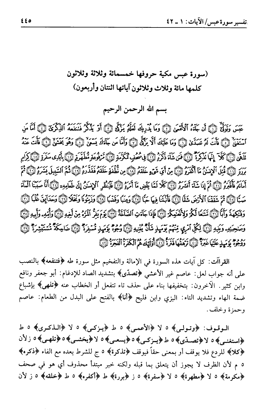 وَتَوَلَّى هـ لا الْأَعْمى هـ ط يَزَّكَّى هـ لا الذِّكْرى هـ ط اسْتَغْنى هـ لا تَصَدَّى هـ ط يَزَّكَّى هـ يَسْعى هـ لا يَخْشى هـ تَلَهَّى هـ ز لأن كَلَّا للردع فلا يوقف أو بمعنى حقا فيوقف تَذْكِرَةٌ هـ ج للشرط بعده مع الفاء ذَكَرَهُ هـ م لأن الظرف لا يجوز أن يتعلق بما قبله ولكنه خبر مبتدأ محذوف أي هو في صحف مُكَرَّمَةٍ هـ لا مُطَهَّرَةٍ هـ لا سَفَرَةٍ هـ ز بَرَرَةٍ ط أَكْفَرَهُ هـ ط خَلَقَهُ هـ ز لأن
