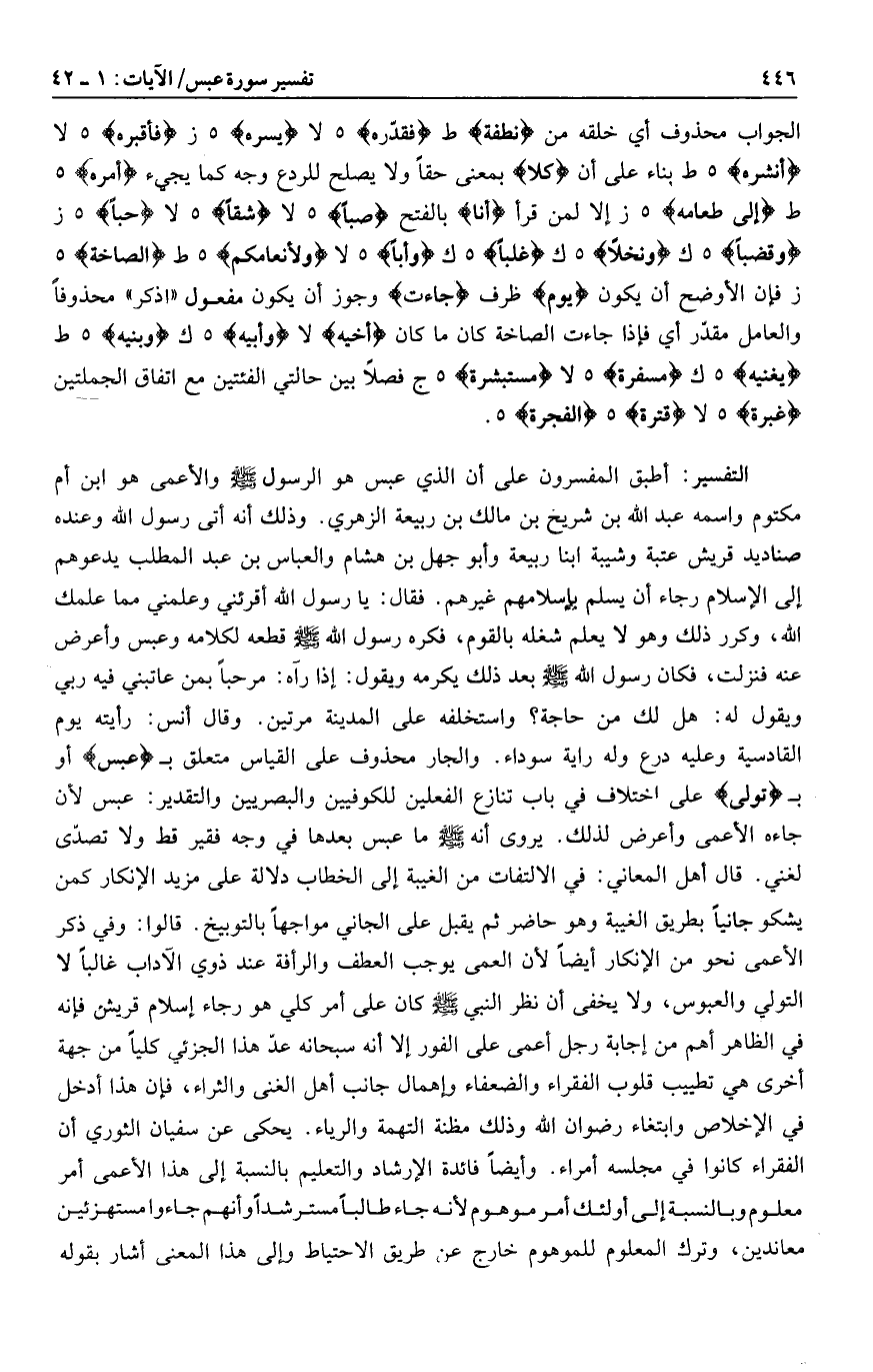 الجواب محذوف أي خلقه من نُطْفَةٍ ط فَقَدَّرَهُ هـ لا يَسَّرَهُ هـ ز فَأَقْبَرَهُ هـ لا أَنْشَرَهُ هـ ط بناء على أن كَلَّا بمعنى حقا ولا يصلح للردع وجه كما يجيء أَمَرَهُ هـ ط إِلى طَعامِهِ هـ ز إلا لمن قرأ أَنَّا بالفتح صَبًّا هـ لا شَقًّا هـ لا حَبًّا هـ ز وَقَضْباً هـ ك وَنَخْلًا هـ ك غُلْباً هـ ك وَأَبًّا هـ لا وَلِأَنْعامِكُمْ هـ ط الصَّاخَّةُ هـ ز فإن الأوضح أن يكون يَوْمَ ظرف جاءَتِ وجوز أن يكون مفعول «اذكر» محذوفا والعامل مقدّر أي فإذا جاءت الصاخة كان ما كان أَخِيهِ لا وَأَبِيهِ هـ ك وَبَنِيهِ هـ ط يُغْنِيهِ هـ ك مُسْفِرَةٌ هـ لا مُسْتَبْشِرَةٌ هـ ج فصلا بين حالتي الفئتين مع اتفاق الجملتين غَبَرَةٌ هـ لا قَتَرَةٌ هـ الْفَجَرَةُ هـ.
