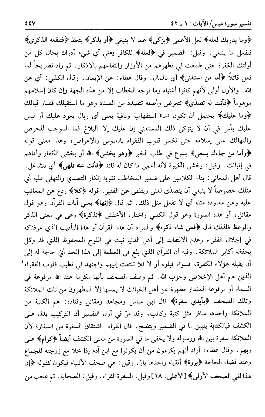 قال أهل المعاني: بناء الكلامين على ضمير المخاطب تقوية إنكار التصدي والتهلي عليه أي مثلك خصوصا لا ينبغي أن يتصدّى لغنى ويتلهى عن الفقير. قوله كَلَّا ردع عن المعاتب عليه وعن معاودة مثله أي لا تفعل مثل ذلك. ثم قال إِنَّها يعني آيات القرآن وهو قول مقاتل، أو هذه السورة وهو قول الكلبي واختاره الأخفش تَذْكِرَةٌ وهي في معنى الذكر والوعظ فلذلك قال فَمَنْ شاءَ ذَكَرَهُ والمراد أن هذا القرآن أو هذا التأديب الذي عرفناكه في إجلال الفقراء وعدم الالتفات إلى أهل الدنيا ثبت في اللوح المحفوظ الذي قد وكل بحفظه أكابر الملائكة. وفيه أن القرآن الذي بلغ في العظمة إلى هذا الحد أيّ حاجة له إلى أن يقبله هؤلاء الكفرة، فسواء قبلوه أو لا فلا تلتفت إليهم واجتهد في تطيب قلوب الفقراء الذين هم أهل الإخلاص وحزب الله. ثم وصف الصحف بأنها مكرمة عند الله مرفوعة في السماء أو مرفوعة المقدار مطهرة عن أهل الخبائث لا يمسها إلا المطهرون من تلك الملائكة وتلك الصحف بِأَيْدِي سَفَرَةٍ قال ابن عباس ومجاهد ومقاتل وقتادة: هم الكتبة من الملائكة واحدها سافر مثل كتبة وكاتب، وقد مرّ في أول التفسير أن التركيب يدل على الكشف فبالكتابة يتبين ما في الضمير ويتضح. قال الفراء: اشتقاق السفرة من السفارة لأن الملائكة سفرة بين الله ورسوله ولا يخفى ما في السورة من معنى الكشف أيضا كِرامٍ على ربهم. وقال عطاء: أراد أنهم يكرمون من أن يكونوا مع ابن آدم إذا خلا مع زوجته للجماع وعند قضاء الحاجة بَرَرَةٍ أتقياء واحدها بارّ. وقيل: هي صحف الأنبياء فيكون كقوله إِنَّ هذا لَفِي الصُّحُفِ الْأُولى [الأعلى: 18] وقيل: السفرة القراء. وقيل: الصحابة. ثم عجب من