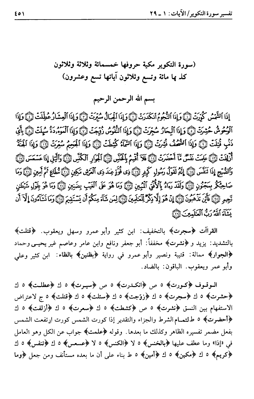 كُوِّرَتْ هـ ص انْكَدَرَتْ هـ ص سُيِّرَتْ هـ ك عُطِّلَتْ هـ ك حُشِرَتْ هـ ك سُجِّرَتْ هـ ك زُوِّجَتْ هـ ك سُئِلَتْ هـ ك قُتِلَتْ هـ ج لاعتراض الاستفهام بين النسق نُشِرَتْ هـ ص كُشِطَتْ هـ ك سُعِّرَتْ هـ ك أُزْلِفَتْ هـ ك أَحْضَرَتْ هـ ط لتمام الشرط والجزاء والتقدير إذا كورت الشمس كورت ارتفعت الشمس بفعل مضمر تفسيره الظاهر وكذلك ما بعدها. وقوله عَلِمَتْ جواب عن الكل وهو العامل في «إذا» وما عطف عليها بِالْخُنَّسِ هـ لا الْكُنَّسِ هـ لا عَسْعَسَ هـ ك تَنَفَّسَ هـ ك كَرِيمٍ هـ ك مَكِينٍ هـ ك أَمِينٍ هـ ط بناء على أن ما بعده مستأنف ومن جعل