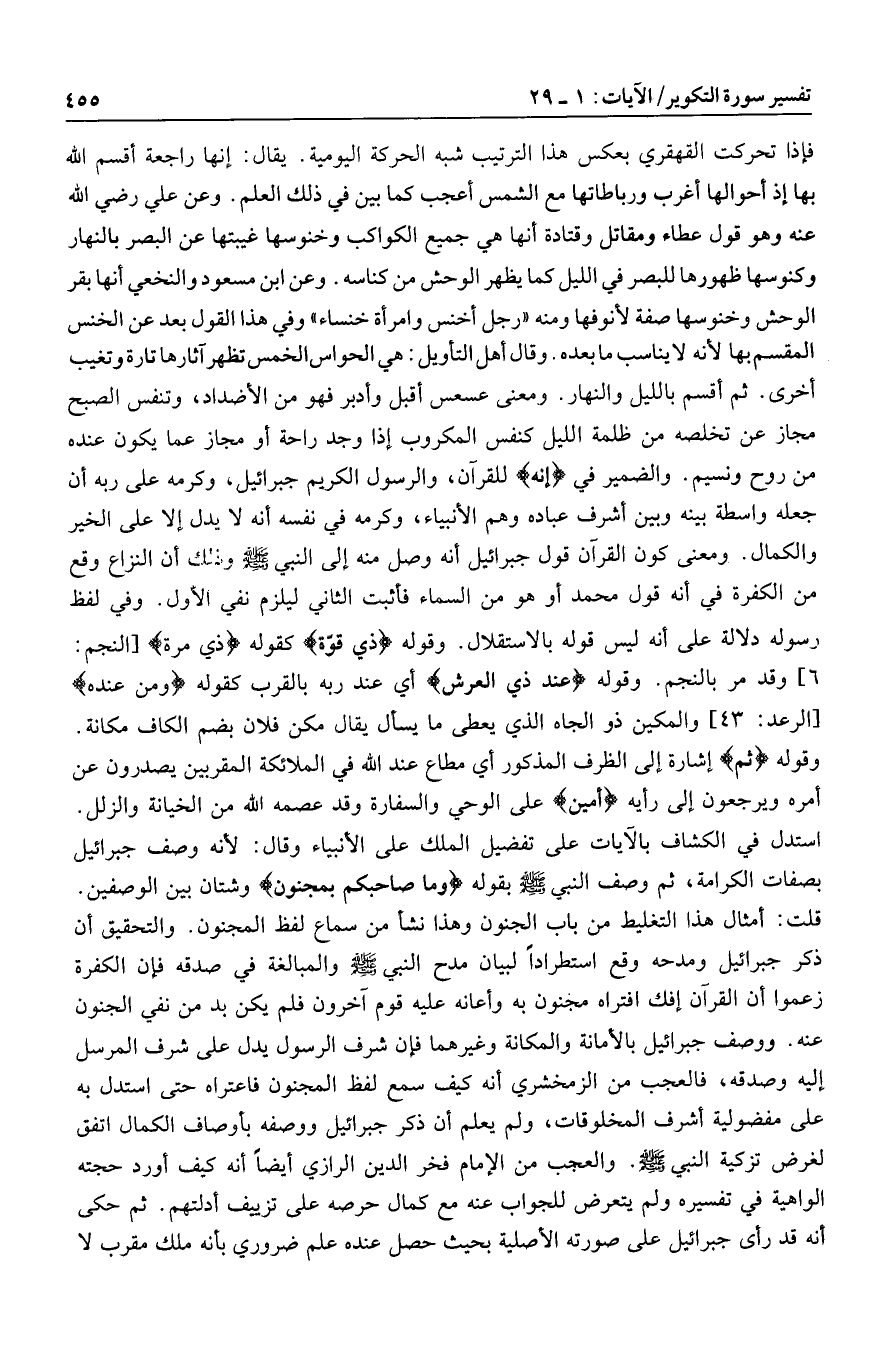 قلت: أمثال هذا التغليط من باب الجنون وهذا نشأ من سماع لفظ المجنون. والتحقيق أن ذكر جبرائيل ومدحه وقع استطرادا لبيان مدح النبي صلى الله عليه وسلم والمبالغة في صدقه فإن الكفرة زعموا أن القرآن إفك افتراه مجنون به وأعانه عليه قوم آخرون فلم يكن بد من نفي الجنون عنه. ووصف جبرائيل بالأمانة والمكانة وغيرهما فإن شرف الرسول يدل على شرف المرسل إليه وصدقه، فالعجب من الزمخشري أنه كيف سمع لفظ المجنون فاعتراه حتى استدل به على مفضولية أشرف المخلوقات، ولم يعلم أن ذكر جبرائيل ووصفه بأوصاف الكمال اتفق لغرض تزكية النبي صلى الله عليه وسلم. والعجب من الإمام فخر الدين الرازي أيضا أنه كيف أورد حجته الواهية في تفسيره ولم يتعرض للجواب عنه مع كمال حرصه على تزييف أدلتهم. ثم حكى أنه قد رأى جبرائيل على صورته الأصلية بحيث حصل عنده علم ضروري بأنه ملك مقرب لا