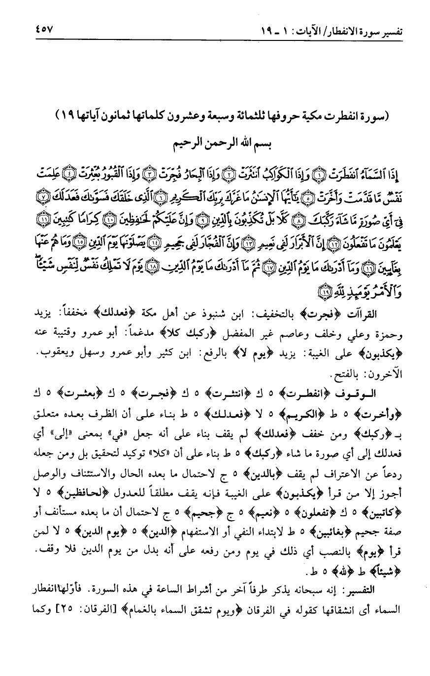 انْفَطَرَتْ هـ ك انْتَثَرَتْ هـ ك فُجِّرَتْ هـ ك بُعْثِرَتْ هـ ك وَأَخَّرَتْ هـ ط الْكَرِيمِ هـ لا فَعَدَلَكَ هـ ط بناء على أن الظرف بعده متعلق ب رَكَّبَكَ ومن خفف فَعَدَلَكَ لم يقف بناء على أنه جعل «في» بمعنى «إلى» أي فعدلك إلى أي صورة ما شاء رَكَّبَكَ هـ ط بناء على أن «كلا» توكيد لتحقيق بل ومن جعله ردعا عن الاعتراف لم يقف بِالدِّينِ هـ ج لاحتمال ما بعده الحال والاستئناف والوصل أجوز إلا من قرأ يكذبون على الغيبة فإنه يقف مطلقا للعدول لَحافِظِينَ هـ لا كاتِبِينَ هـ ك تَفْعَلُونَ هـ نَعِيمٍ هـ ج جَحِيمٍ هـ ج لاحتمال أن ما بعده مستأنف أو صفة جحيم بِغائِبِينَ هـ ط لابتداء النفي أو الاستفهام الدِّينِ هـ يَوْمُ الدِّينِ هـ لا لمن قرأ يوم بالنصب أي ذلك في يوم ومن رفعه على أنه بدل من يوم الدين فلا وقف.
