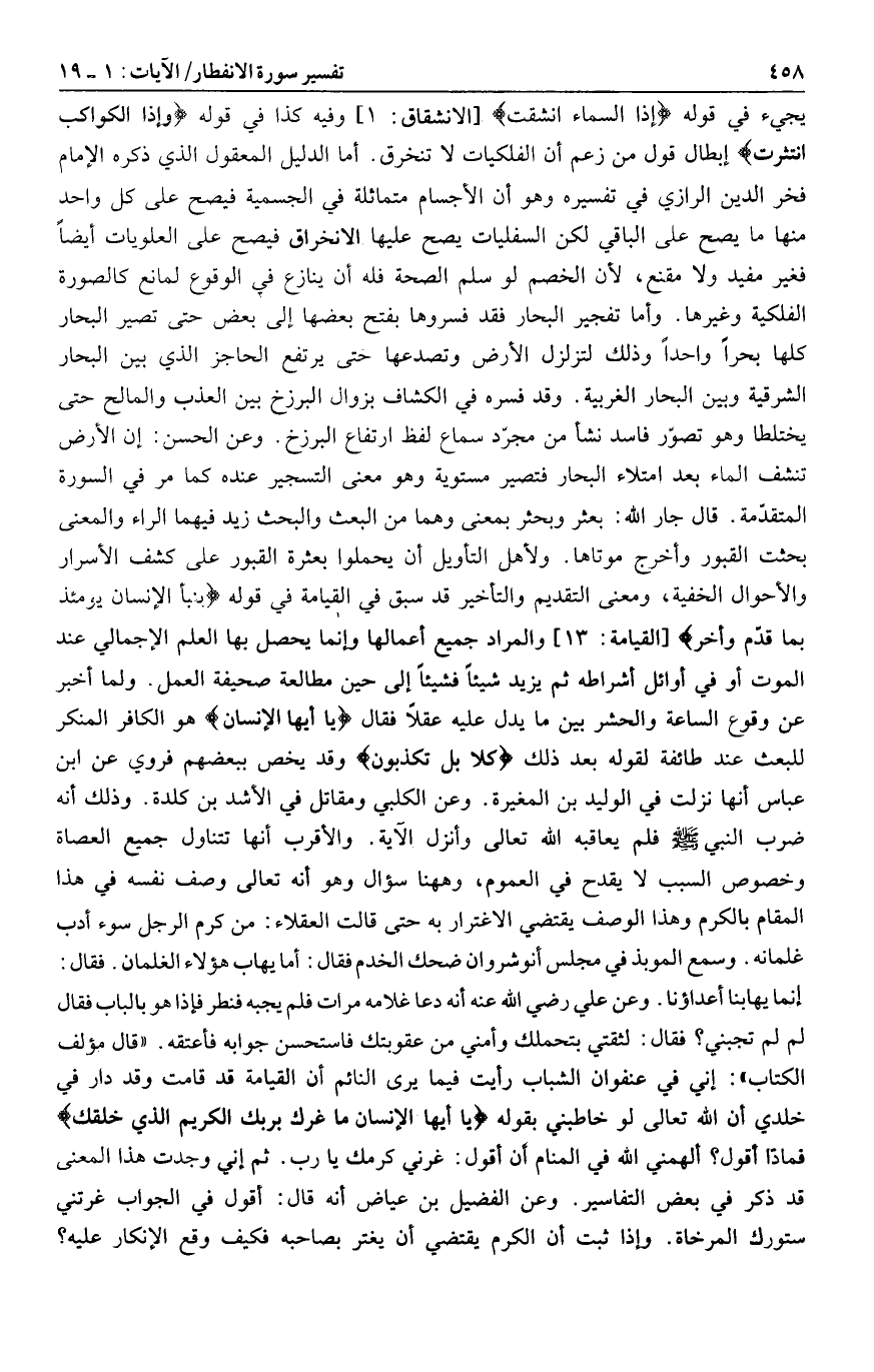 يجيء في قوله إِذَا السَّماءُ انْشَقَّتْ [الانشقاق: 1] وفيه كذا في قوله وَإِذَا الْكَواكِبُ انْتَثَرَتْ إبطال قول من زعم أن الفلكيات لا تنخرق. أما الدليل المعقول الذي ذكره الإمام فخر الدين الرازي في تفسيره وهو أن الأجسام متماثلة في الجسمية فيصح على كل واحد منها ما يصح على الباقي لكن السفليات يصح عليها الانخراق فيصح على العلويات أيضا فغير مفيد ولا مقنع، لأن الخصم لو سلم الصحة فله أن ينازع فى الوقوع لمانع كالصورة الفلكية وغيرها. وأما تفجير البحار فقد فسروها بفتح بعضها إلى بعض حتى تصير البحار كلها بحرا واحدا وذلك لتزلزل الأرض وتصدعها حتى يرتفع الحاجز الذي بين البحار الشرقية وبين البحار الغربية. وقد فسره في الكشاف بزوال البرزخ بين العذب والمالح حتى يختلطا وهو تصوّر فاسد نشأ من مجرّد سماع لفظ ارتفاع البرزخ. وعن الحسن: إن الأرض تنشف الماء بعد امتلاء البحار فتصير مستوية وهو معنى التسجير عنده كما مر في السورة المتقدّمة. قال جار الله: بعثر وبحثر بمعنى وهما من البعث والبحث زيد فيهما الراء والمعنى بحثت القبور وأخرج موتاها. ولأهل التأويل أن يحملوا بعثرة القبور على كشف الأسرار والأحوال الخفية، ومعنى التقديم والتأخير قد سبق في القيامة في قوله يُنَبَّؤُا الْإِنْسانُ يَوْمَئِذٍ بِما قَدَّمَ وَأَخَّرَ