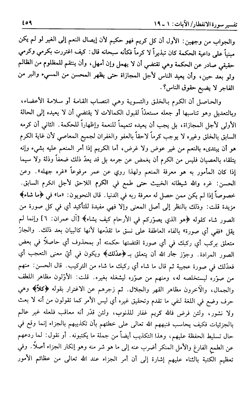 والحاصل أن الكرم بالخلق والتسوية وهي انتصاب القامة أو سلامة الأعضاء، وبالتعديل وهو تناسبها أو جعله مستعدّا لقبول الكمالات لا يقتضي أن لا يعيده إلى الحالة الأولى لأجل المجازاة، بل يجب أن يعيده تتميما للنعمة وإظهارا للحكمة. الثاني أن كرمه السابق بالخلق وغيره لا يوجب كرما لا حقا بالعفو والغفران لجميع المعاصي لأن غاية الكرم هو أن يبتدئ بالنعم من غير عوض ولا غرض، أما الكريم إذا أمر المنعم عليه بشيء وإنه يتلقاه بالعصيان فليس من الكرم أن يغمض عن جرمه بل قد يعدّ ذلك ضعفا وذلة ولا سيما إذا كان المأمور به هو معرفة المنعم ولهذا روي عن عمر مرفوعا «غره جهله» . وعن الحسن: غره والله شيطانه الخبيث حتى طمع في الكرم اللاحق لأجل الكرم السابق.
