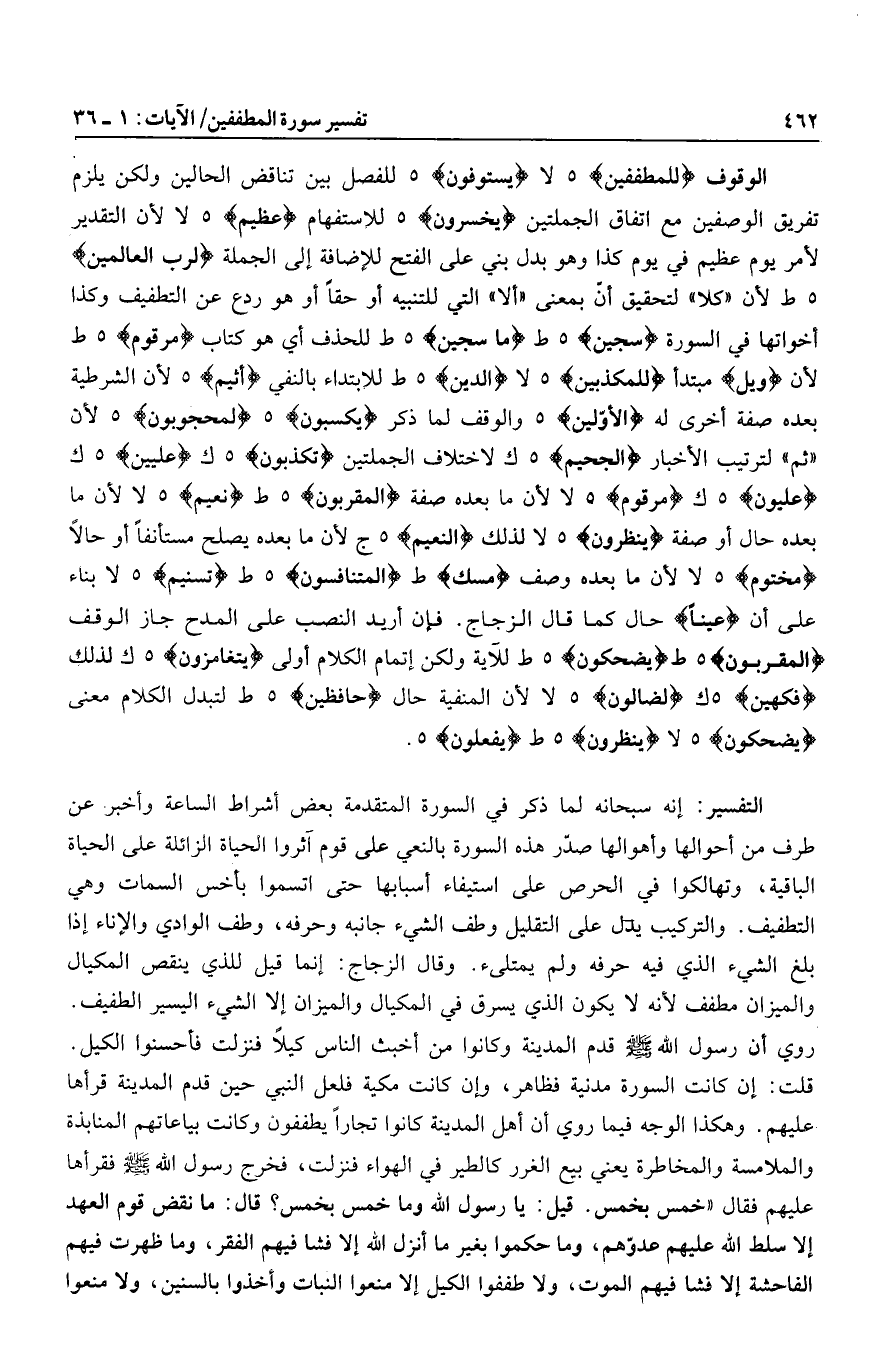 لِلْمُطَفِّفِينَ هـ لا يَسْتَوْفُونَ هـ للفصل بين تناقض الحالين ولكن يلزم تفريق الوصفين مع اتفاق الجملتين يُخْسِرُونَ هـ للاستفهام عَظِيمٍ هـ لا لأن التقدير لأمر يوم عظيم في يوم كذا وهو بدل بني على الفتح للإضافة إلى الجملة لِرَبِّ الْعالَمِينَ هـ ط لأن «كلا» لتحقيق أنّ بمعنى «ألا» التي للتنبيه أو حقا أو هو ردع عن التطفيف وكذا أخواتها في السورة سِجِّينٍ هـ ط ما سِجِّينٌ هـ ط للحذف أي هو كتاب مَرْقُومٌ هـ ط لأن وَيْلٌ مبتدأ لِلْمُكَذِّبِينَ هـ لا الدِّينِ هـ ط للابتداء بالنفي أَثِيمٍ هـ لأن الشرطية بعده صفة أخرى له الْأَوَّلِينَ هـ والوقف لما ذكر يَكْسِبُونَ هـ لَمَحْجُوبُونَ هـ لأن «ثم» لترتيب الأخبار الْجَحِيمِ هـ ك لاختلاف الجملتين تُكَذِّبُونَ هـ ك عِلِّيِّينَ هـ ك عِلِّيُّونَ هـ ك مَرْقُومٌ هـ لا لأن ما بعده صفة الْمُقَرَّبُونَ هـ ط نَعِيمٍ هـ لا لأن ما بعده حال أو صفة يَنْظُرُونَ هـ لا لذلك النَّعِيمِ هـ ج لأن ما بعده يصلح مستأنفا أو حالا مَخْتُومٍ هـ لا لأن ما بعده وصف مِسْكٌ ط الْمُتَنافِسُونَ هـ ط تَسْنِيمٍ هـ لا بناء على أن عَيْناً حال كما قال الزجاج. فإن أريد النصب على المدح جاز الوقف الْمُقَرَّبُونَ هـ ط يَضْحَكُونَ هـ ط للآية ولكن إتمام الكلام أولى يَتَغامَزُونَ
