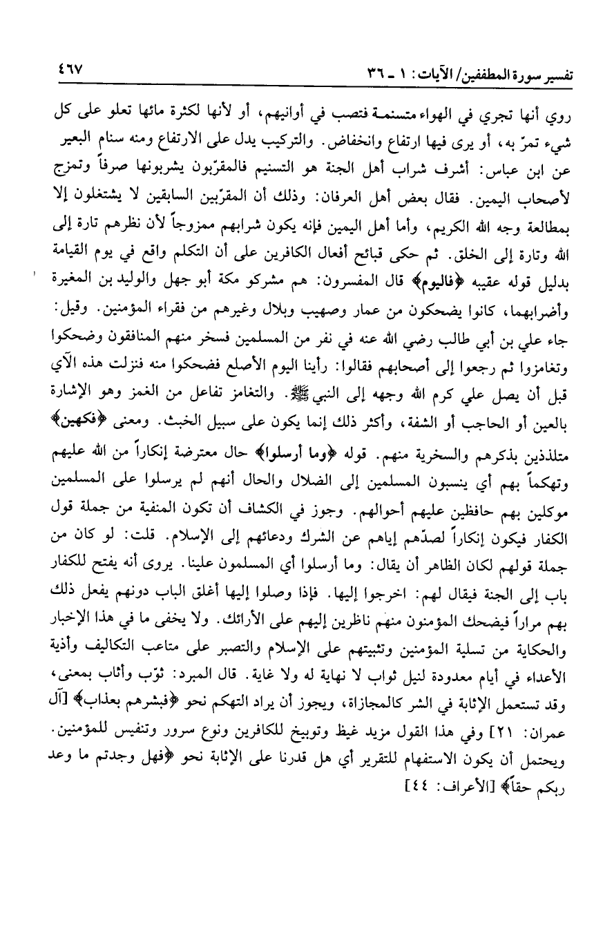 روي أنها تجري في الهواء متسنمة فتصب في أوانيهم، أو لأنها لكثرة مائها تعلو على كل شيء تمرّ به، أو يرى فيها ارتفاع وانخفاض. والتركيب يدل على الارتفاع ومنه سنام البعير عن ابن عباس: أشرف شراب أهل الجنة هو التسنيم فالمقرّبون يشربونها صرفا وتمزج لأصحاب اليمين. فقال بعض أهل العرفان: وذلك أن المقرّبين السابقين لا يشتغلون إلا بمطالعة وجه الله الكريم، وأما أهل اليمين فإنه يكون شرابهم ممزوجا لأن نظرهم تارة إلى الله وتارة إلى الخلق. ثم حكى قبائح أفعال الكافرين على أن التكلم واقع في يوم القيامة بدليل قوله عقيبه فَالْيَوْمَ قال المفسرون: هم مشركو مكة أبو جهل والوليد بن المغيرة وأضرابهما، كانوا يضحكون من عمار وصهيب وبلال وغيرهم من فقراء المؤمنين.