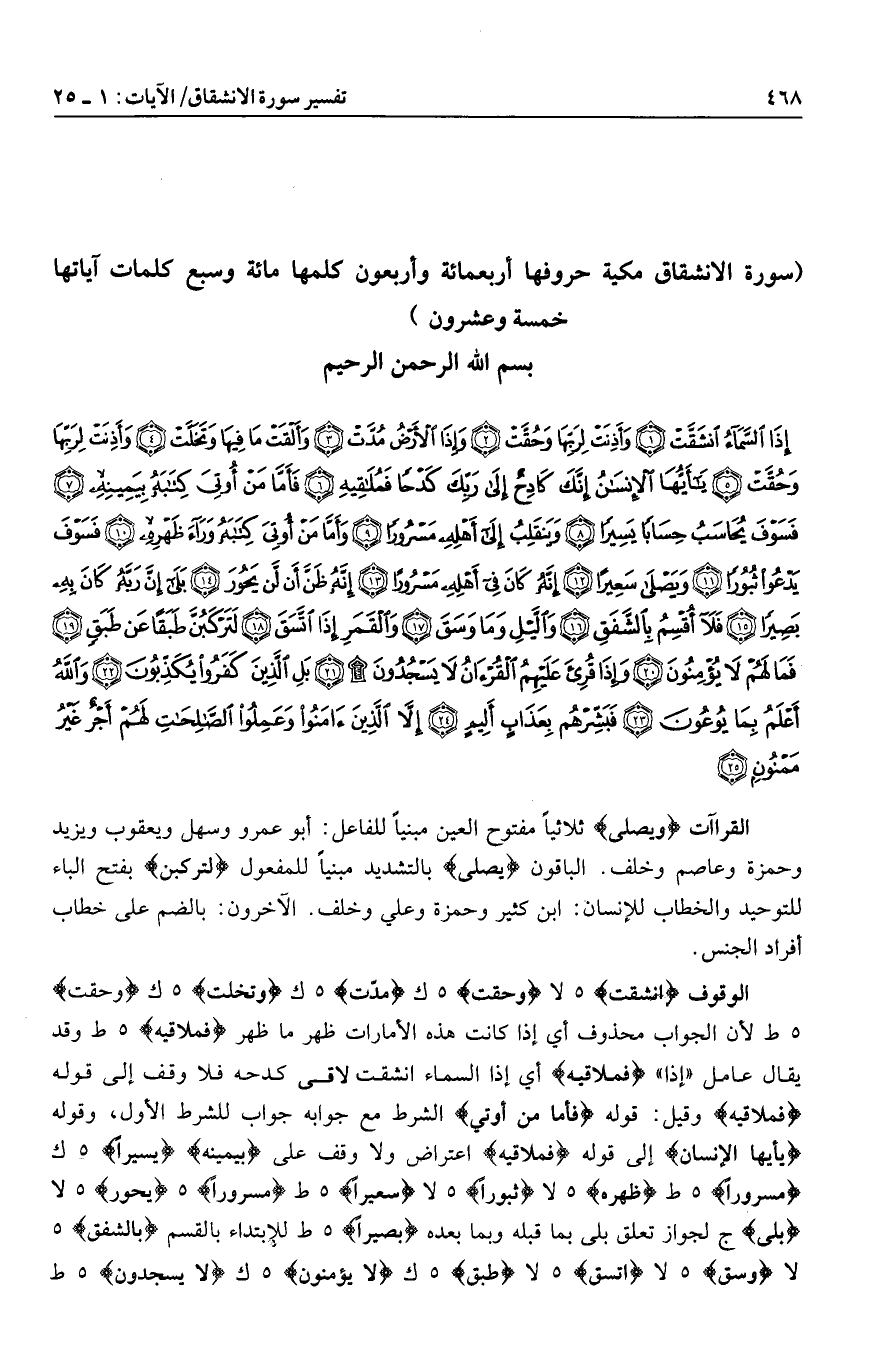 وَيَصْلى ثلاثيا مفتوح العين مبنيا للفاعل: أبو عمرو وسهل ويعقوب ويزيد وحمزة وعاصم وخلف. الباقون يصلى بالتشديد مبنيا للمفعول لَتَرْكَبُنَّ بفتح الباء للتوحيد والخطاب للإنسان: ابن كثير وحمزة وعلي وخلف. الآخرون: بالضم على خطاب أفراد الجنس.