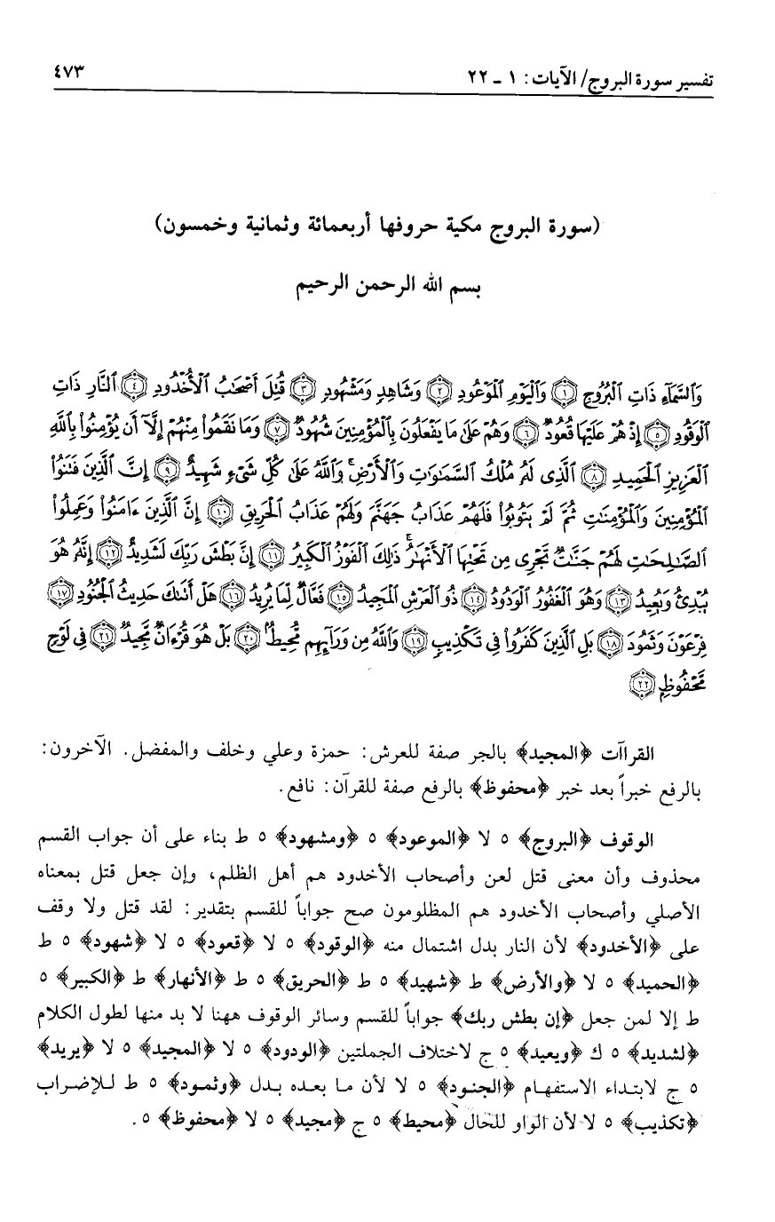 الْبُرُوجِ هـ لا الْمَوْعُودِ هـ وَمَشْهُودٍ هـ ط بناء على أن جواب القسم محذوف وأن معنى قتل لعن وأصحاب الأخدود هم أهل الظلم، وإن جعل قتل بمعناه الأصلي وأصحاب الأخدود هم المظلومون صح جوابا للقسم بتقدير: لقد قتل ولا وقف على الْأُخْدُودِ لأن النار بدل اشتمال منه الْوَقُودِ هـ لا قُعُودٌ هـ لا شُهُودٌ هـ ط الْحَمِيدِ هـ لا وَالْأَرْضِ ط شَهِيدٌ هـ ط الْحَرِيقِ هـ ط الْأَنْهارُ ط الْكَبِيرُ هـ ط إلا لمن جعل إِنَّ بَطْشَ رَبِّكَ جوابا للقسم وسائر الوقوف هاهنا لا بد منها لطول الكلام لَشَدِيدٌ هـ ك وَيُعِيدُ هـ ج لاختلاف الجملتين الْوَدُودُ هـ لا الْمَجِيدُ هـ لا يُرِيدُ هـ ج لابتداء الاستفهام الْجُنُودِ هـ لا لأن ما بعده بدل وَثَمُودَ هـ ط للإضراب تَكْذِيبٍ هـ لا لأن الواو للحال مُحِيطٌ هـ ج مَجِيدٌ هـ لا مَحْفُوظٍ هـ.