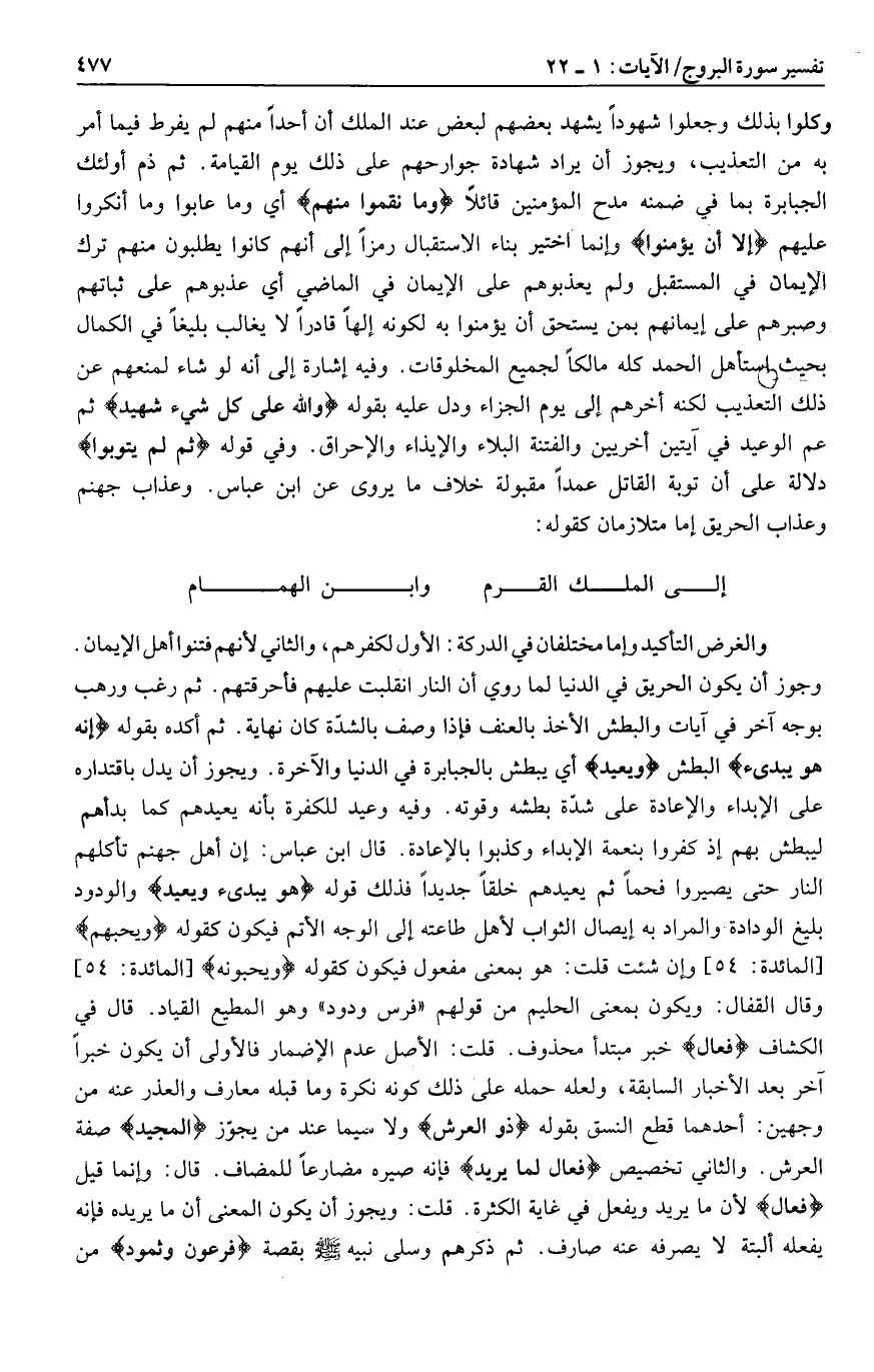 وكلوا بذلك وجعلوا شهودا يشهد بعضهم لبعض عند الملك أن أحدا منهم لم يفرط فيما أمر به من التعذيب، ويجوز أن يراد شهادة جوارحهم على ذلك يوم القيامة. ثم ذم أولئك الجبابرة بما في ضمنه مدح المؤمنين قائلا وَما نَقَمُوا مِنْهُمْ أي وما عابوا وما أنكروا عليهم إِلَّا أَنْ يُؤْمِنُوا وإنما اختير بناء الاستقبال رمزا إلى أنهم كانوا يطلبون منهم ترك الإيمان في المستقبل ولم يعذبوهم على الإيمان في الماضي أي عذبوهم على ثباتهم وصبرهم على إيمانهم بمن يستحق أن يؤمنوا به لكونه إلها قادرا لا يغالب بليغا في الكمال بحيث استأهل الحمد كله مالكا لجميع المخلوقات. وفيه إشارة إلى أنه لو شاء لمنعهم عن ذلك التعذيب لكنه أخرهم إلى يوم الجزاء ودل عليه بقوله وَاللَّهُ عَلى كُلِّ شَيْءٍ شَهِيدٌ ثم عم الوعيد في آيتين أخريين والفتنة البلاء والإيذاء والإحراق. وفي قوله ثُمَّ لَمْ يَتُوبُوا دلالة على أن توبة القاتل عمدا مقبولة خلاف ما يروى عن ابن عباس. وعذاب جهنم وعذاب الحريق إما متلازمان كقوله: