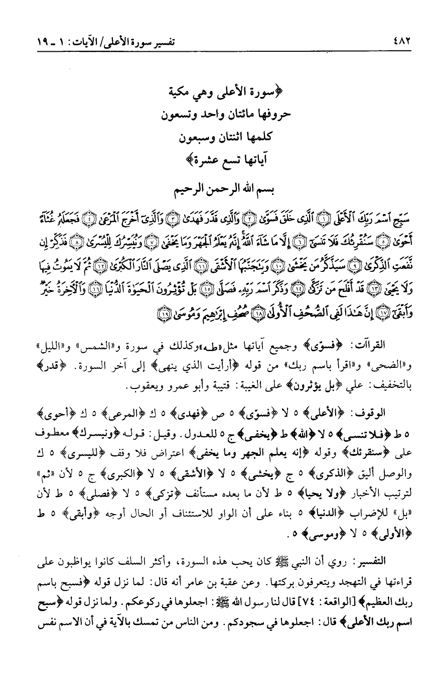 الْأَعْلَى هـ لا فَسَوَّى هـ ص فَهَدى هـ ك الْمَرْعى هـ ك أَحْوى هـ ط فَلا تَنْسى هـ لا اللَّهُ ط يَخْفى ج هـ للعدول. وقيل: قوله وَنُيَسِّرُكَ معطوف على سَنُقْرِئُكَ وقوله إِنَّهُ يَعْلَمُ الْجَهْرَ وَما يَخْفى اعتراض فلا وقف لِلْيُسْرى هـ ك والوصل أليق الذِّكْرى هـ ج يَخْشى هـ لاَْشْقَى