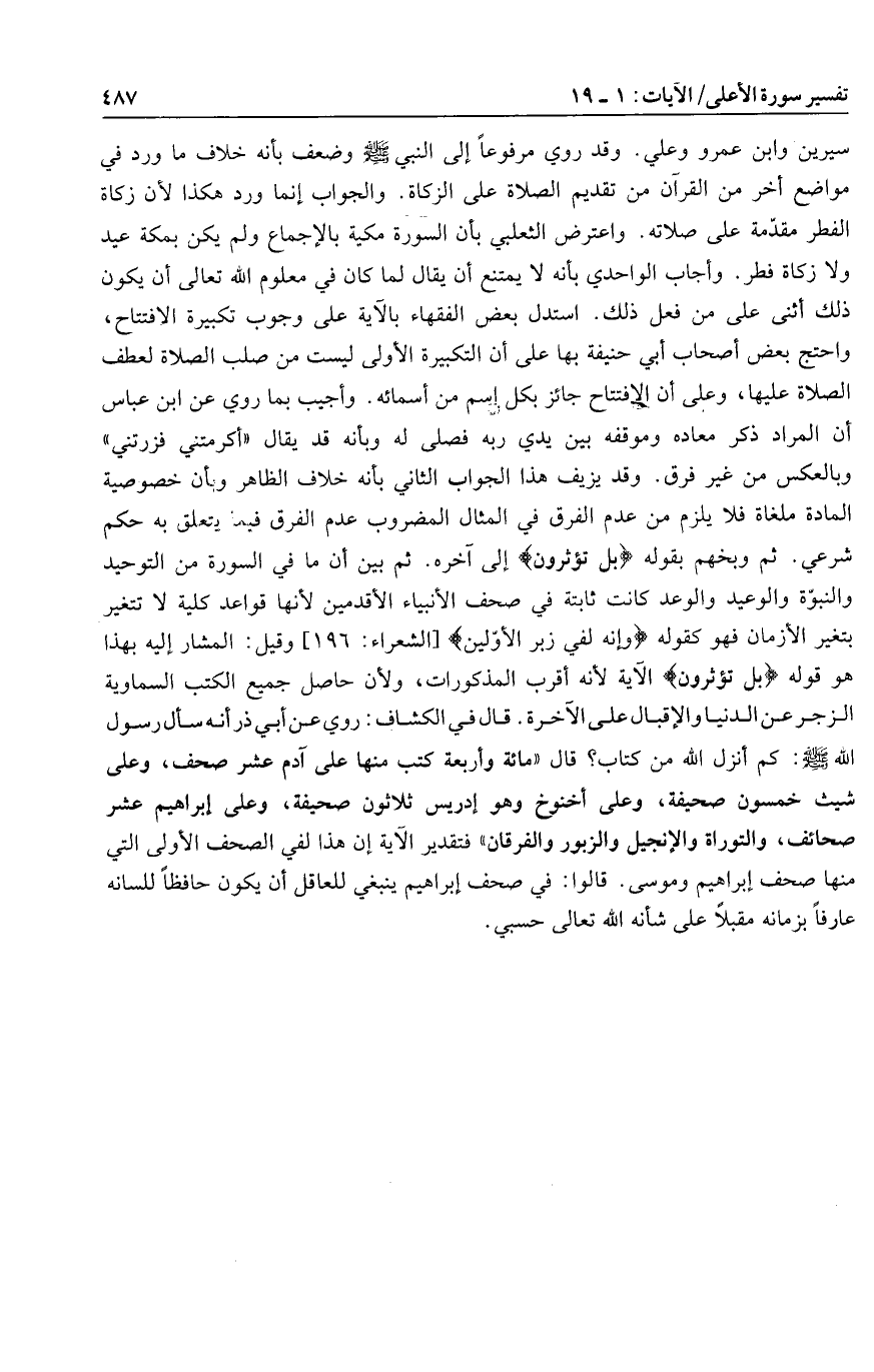 وضعف بأنه خلاف ما ورد في مواضع أخر من القرآن من تقديم الصلاة على الزكاة. والجواب إنما ورد هكذا لأن زكاة الفطر مقدّمة على صلاته. واعترض الثعلبي بأن السورة مكية بالإجماع ولم يكن بمكة عيد ولا زكاة فطر. وأجاب الواحدي بأنه لا يمتنع أن يقال لما كان في معلوم الله تعالى أن يكون ذلك أثنى على من فعل ذلك. استدل بعض الفقهاء بالآية على وجوب تكبيرة الافتتاح، واحتج بعض أصحاب أبي حنيفة بها على أن التكبيرة الأولى ليست من صلب الصلاة لعطف الصلاة عليها، وعلى أن الافتتاح جائز بكل اسم من أسمائه. وأجيب بما روي عن ابن عباس أن المراد ذكر معاده وموقفه بين يدي ربه فصلى له وبأنه قد يقال «أكرمتني فزرتني» وبالعكس من غير فرق. وقد يزيف هذا الجواب الثاني بأنه خلاف الظاهر وبأن خصوصية المادة ملغاة فلا يلزم من عدم الفرق في المثال المضروب عدم الفرق فيما يتعلق به حكم شرعي. ثم وبخهم بقوله بَلْ تُؤْثِرُونَ إلى آخره. ثم بين أن ما في السورة من التوحيد والنبوّة والوعيد والوعد كانت ثابتة في صحف الأنبياء الأقدمين لأنها قواعد كلية لا تتغير بتغير الأزمان فهو كقوله وَإِنَّهُ لَفِي زُبُرِ الْأَوَّلِينَ [الشعراء: 196] وقيل: المشار إليه بهذا هو قوله بَلْ تُؤْثِرُونَ الآية لأنه أقرب المذكورات، ولأن حاصل جميع الكتب السماوية الزجر عن الدنيا والإقبال على الآخرة.