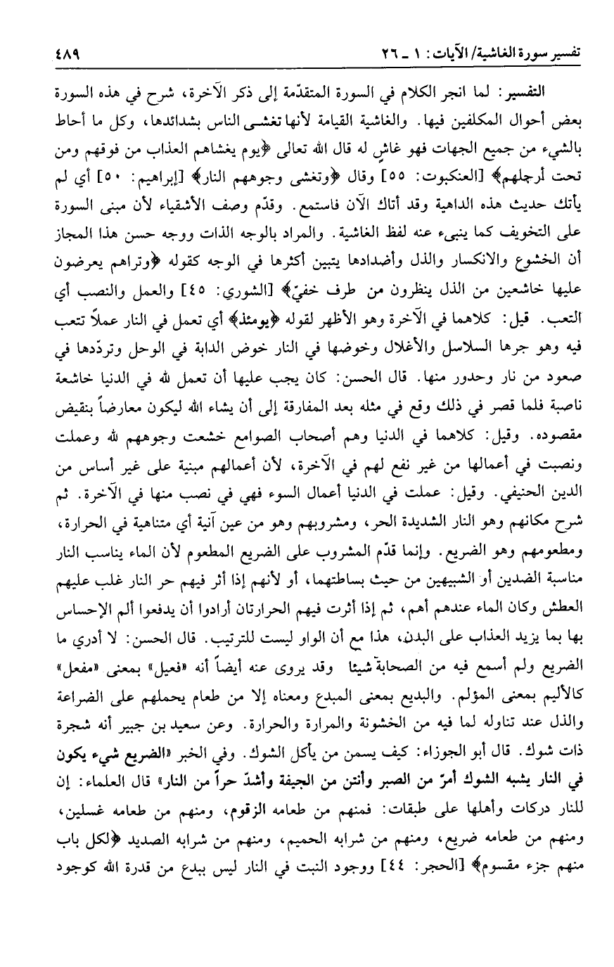 لما انجر الكلام في السورة المتقدّمة إلى ذكر الآخرة، شرح في هذه السورة بعض أحوال المكلفين فيها. والغاشية القيامة لأنها تغشى الناس بشدائدها، وكل ما أحاط بالشيء من جميع الجهات فهو غاش له قال الله تعالى يَوْمَ يَغْشاهُمُ الْعَذابُ مِنْ فَوْقِهِمْ وَمِنْ تَحْتِ أَرْجُلِهِمْ [العنكبوت: 55] وقال وَتَغْشى وُجُوهَهُمُ النَّارُ [إبراهيم: 50] أي لم يأتك حديث هذه الداهية وقد أتاك الآن فاستمع. وقدّم وصف الأشقياء لأن مبنى السورة على التخويف كما ينبئ عنه لفظ الغاشية. والمراد بالوجه الذات ووجه حسن هذا المجاز أن الخشوع والانكسار والذل وأضدادها يتبين أكثرها في الوجه كقوله وَتَراهُمْ يُعْرَضُونَ عَلَيْها خاشِعِينَ مِنَ الذُّلِّ يَنْظُرُونَ مِنْ طَرْفٍ خَفِيٍّ [الشوري: 45] والعمل والنصب أي التعب. قيل: كلاهما في الآخرة وهو الأظهر لقوله يَوْمَئِذٍ أي تعمل في النار عملا تتعب فيه وهو جرها السلاسل والأغلال وخوضها في النار خوض الدابة في الوحل وتردّدها في صعود من نار وحدور منها. قال الحسن: كان يجب عليها أن تعمل لله في الدنيا خاشعة ناصبة فلما قصر في ذلك وقع في مثله بعد المفارقة إلى أن يشاء الله ليكون معارضا بنقيض مقصوده. وقيل: كلاهما في الدنيا وهم أصحاب الصوامع خشعت وجوههم لله وعملت ونصبت في أعمالها من غير نفع لهم في الآخرة، لأن أعمالهم مبنية على غير أساس من الدين الحنيفي. وقيل: عملت في الدنيا أعمال السوء فهي في نصب منها في الآخرة. ثم شرح مكانهم وهو النار الشديدة الحر، ومشروبهم وهو من عين آنية أي متناهية في الحرارة، ومطعومهم وهو الضريع. وإنما قدّم المشروب على الضريع المطعوم لأن الماء يناسب النار مناسبة الضدين أو الشبيهين من حيث بساطتهما، أو لأنهم إذا أثر فيهم حر النار غلب عليهم العطش وكان الماء عندهم أهم، ثم إذا أثرت فيهم الحرارتان أرادوا أن يدفعوا ألم الإحساس بها بما يزيد العذاب على البدن، هذا مع أن الواو ليست للترتيب. قال الحسن: لا أدري ما الضريع ولم أسمع فيه من الصحابة شيئا وقد يروى عنه أيضا أنه «فعيل» بمعنى «مفعل» كالأليم بمعنى المؤلم. والبديع بمعنى المبدع ومعناه إلا من طعام يحملهم على الضراعة والذل عند تناوله لما فيه من الخشونة والمرارة والحرارة. وعن سعيد بن جبير أنه شجرة ذات شوك. قال أبو الجوزاء: كيف يسمن من يأكل الشوك.