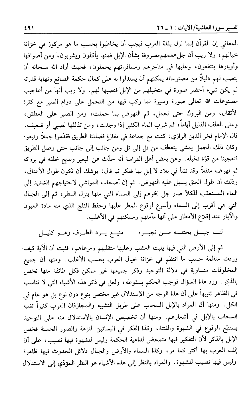 ثم إلى الأرض التي فيها ينبت العشب وعليها متقلبهم ومرعاهم، فثبت أن الآية كيف وردت منظمة حسب ما انتظم في خزانة خيال العرب بحسب الأغلب. ومنها أن جميع المخلوقات متساوية في دلالة التوحيد وذكر جميعها غير ممكن فكل طائفة منها تخص بالذكر. ورد هذا السؤال فوجب الحكم بسقوطه، ولعل في ذكر هذه الأشياء التي لا تناسب في الظاهر تنبيها على أن هذا الوجه من الاستدلال غير مختص بنوع دون نوع بل هو عام في الكل. ومنها أن المراد بالإبل السحاب على طريق التشبيه والمجازفان العرب كثيرا تشبه السحاب بالإبل في أشعارهم. ومنها أن تخصيص الإنسان بالاستدلال منه على التوحيد يستتبّع الوقوع في الشهوة والفتنة، وكذا الفكر في البساتين النزهة والصور الحسنة فخص الإبل بالذكر لأن التفكير فيها متمحض لداعية الحكمة وليس للشهوة فيها نصيب، على أن إلف العرب بها أكثر كما مر، وكذا السماء والأرض والجبال دلائل الحدوث فيها ظاهرة وليس فيها نصيب للشهوة. والمراد بالنظر إلى هذه الأشياء هو النظر المؤدّي إلى الاستدلال
