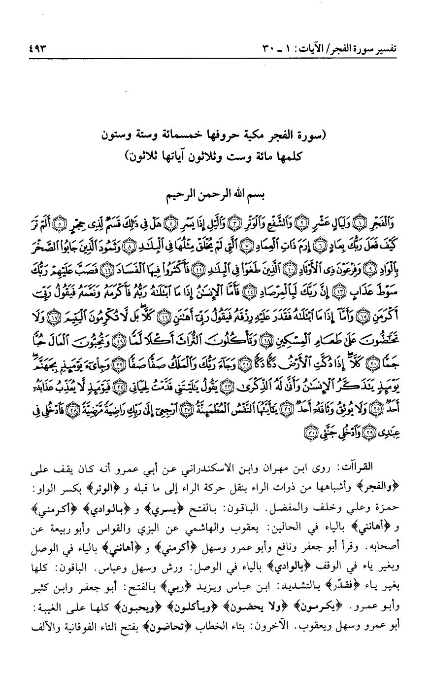 حمزة وعلي وخلف والمفضل. الباقون: بالفتح يسري وبِالْوادِ أكرمني وأهانني بالياء في الحالين: يعقوب والهاشمي عن البزي والقواس وأبو ربيعة عن أصحابه. وقرأ أبو جعفر ونافع وأبو عمرو وسهل أكرمني وأهانني بالياء في الوصل وبغير ياء في الوقف بِالْوادِ بالياء في الوصل: ورش وسهل وعباس. الباقون: كلها بغير ياء فقدر بالتشديد: ابن عباس ويزيد ربي بالفتح: أبو جعفر وابن كثير وأبو عمرو. يكرمون ولا يحضون ويأكلون ويحبون كلها على الغيبة: