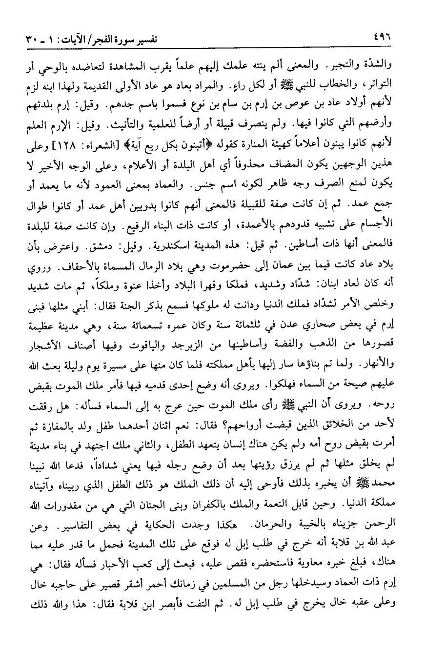 وحين قابل النعمة والملك بالكفران وبنى الجنان التي هي من مقدورات الله الرحمن جزيناه بالخيبة والحرمان. هكذا وجدت الحكاية في بعض التفاسير. وعن عبد الله بن قلابة أنه خرج في طلب إبل له فوقع على تلك المدينة فحمل ما قدر عليه مما هناك، فبلغ خبره معاوية فاستحضره فقص عليه، فبعث إلى كعب الأحبار فسأله فقال: هي إرم ذات العماد وسيدخلها رجل من المسلمين في زمانك أحمر أشقر قصير على حاجبه خال وعلى عقبه خال يخرج في طلب إبل له. ثم التفت فأبصر ابن قلابة فقال: هذا والله ذلك