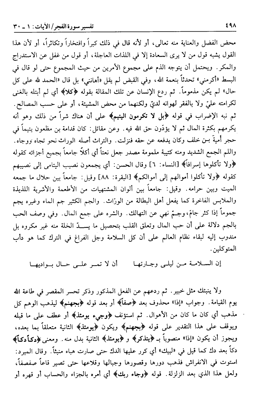 ثم نبه الإضراب في قوله بَلْ لا تُكْرِمُونَ الْيَتِيمَ على أن هناك شرا من ذلك وهو أنه يكرمهم بكثرة المال ثم لا يؤدّون حق الله فيه. وعن مقاتل: كان قدامة بن مظعون يتيما في حجر أمية بن خلف وكان يدفعه عن حقه فنزلت. والتراث أصله الوراث نحو تجاه ووجاه.