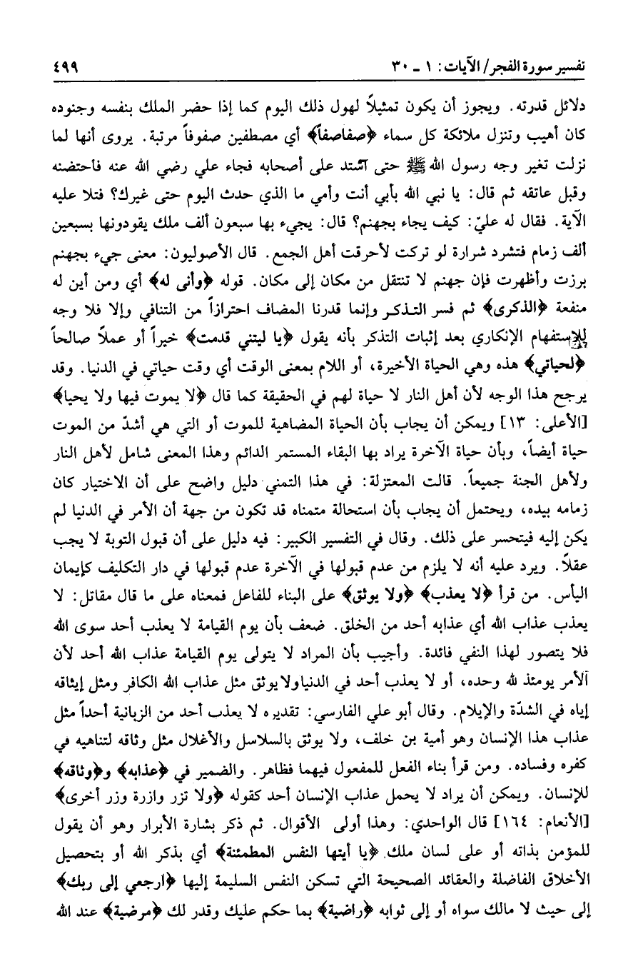 قال الأصوليون: معنى جيء بجهنم برزت وأظهرت فإن جهنم لا تنتقل من مكان إلى مكان. قوله وَأَنَّى لَهُ أي ومن أين له منفعة الذِّكْرى ثم فسر التذكر وإنما قدرنا المضاف احترازا من التنافي وإلا فلا وجه للإستفهام الإنكاري بعد إثبات التذكر بأنه يقول يا لَيْتَنِي قَدَّمْتُ خيرا أو عملا صالحا لِحَياتِي هذه وهي الحياة الأخيرة، أو اللام بمعنى الوقت أي وقت حياتي في الدنيا. وقد يرجح هذا الوجه لأن أهل النار لا حياة لهم في الحقيقة كما قال لا يَمُوتُ فِيها وَلا يَحْيى [الأعلى: 13] ويمكن أن يجاب بأن الحياة المضاهية للموت أو التي هي أشدّ من الموت حياة أيضا، وبأن حياة الآخرة يراد بها البقاء المستمر الدائم وهذا المعنى شامل لأهل النار ولأهل الجنة جميعا. قالت المعتزلة: في هذا التمني دليل واضح على أن الاختيار كان زمامه بيده، ويحتمل أن يجاب بأن استحالة متمناه قد تكون من جهة أن الأمر في الدنيا لم يكن إليه فيتحسر على ذلك. وقال في التفسير الكبير: فيه دليل على أن قبول التوبة لا يجب عقلا. ويرد عليه أنه لا يلزم من عدم قبولها في الآخرة عدم قبولها في دار التكليف كإيمان اليأس. من قرأ لا يُعَذِّبُ وَلا يُوثِقُ على البناء للفاعل فمعناه على ما قال مقاتل: لا يعذب عذاب الله أي عذابه أحد من الخلق. ضعف بأن يوم القيامة لا يعذب أحد سوى الله فلا يتصور لهذا النفي فائدة. وأجيب بأن المراد لا يتولى يوم القيامة عذاب الله أحد لأن الأمر يومئذ لله وحده، أو لا يعذب أحد في الدنيا ولا يوثق مثل عذاب الله الكافر ومثل إيثاقه إياه في الشدّة والإيلام. وقال أبو علي الفارسي: تقديره لا يعذب أحد من الزبانية أحدا مثل عذاب هذا الإنسان وهو أمية بن خلف، ولا يوثق بالسلاسل والأغلال مثل وثاقه لتناهيه في كفره وفساده. ومن قرأ بناء الفعل للمفعول فيهما فظاهر. والضمير في عَذابَهُ ووَثاقَهُ للإنسان. ويمكن أن يراد لا يحمل عذاب الإنسان أحد كقوله وَلا تَزِرُ وازِرَةٌ وِزْرَ أُخْرى [الأنعام: 164] قال الواحدي: وهذا أولى الأقوال. ثم ذكر بشارة الأبرار وهو أن يقول للمؤمن بذاته أو على لسان ملك يا أَيَّتُهَا النَّفْسُ الْمُطْمَئِنَّةُ أي بذكر الله أو بتحصيل الأخلاق الفاضلة والعقائد الصحيحة التي تسكن النفس السليمة إليها ارْجِعِي إِلى رَبِّكِ إلى حيث لا مالك سواه أو إلى ثوابه راضِيَةً بما حكم عليك وقدر لك مَرْضِيَّةً عند الله